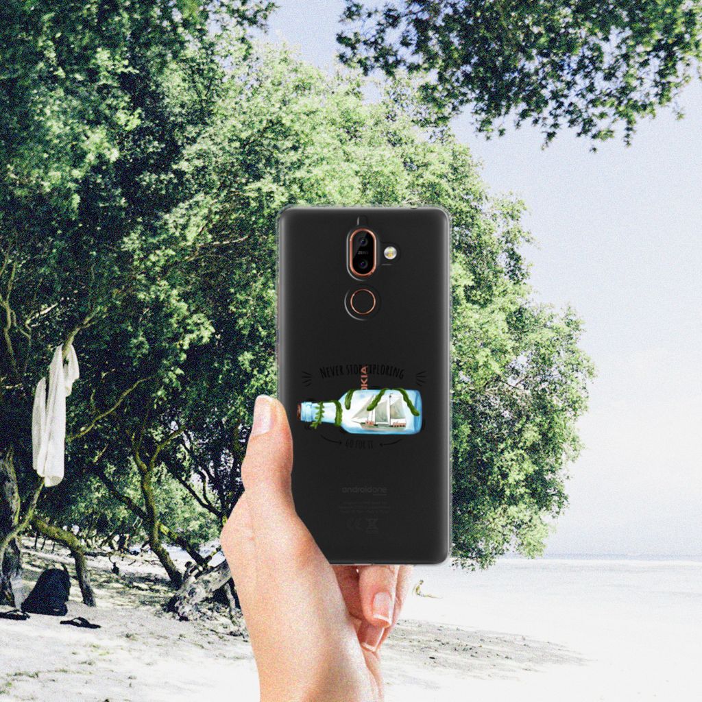 Dit leuke design met een schip in een fles is voor de echte avonturier of reiziger. Dankzij de tekst ‘Never stop exploring: Go for it’ word je altijd herinnerd aan het feit dat het volgende avontuur weer op de loer ligt! Dit design staat op een Telefoonhoesje met Naam voor je Nokia 7 Plus. TPU is flexibel en heel erg sterk. Zo is je telefoon aan de achterkant en de randen heel goed beschermd. De case is aan de bovenkant bedrukt, de randen blijven transparant. Het TPU-hoesje is perfect te combineren met een screenprotector, zo zijn je telefoon en je beeldscherm altijd goed beschermd.