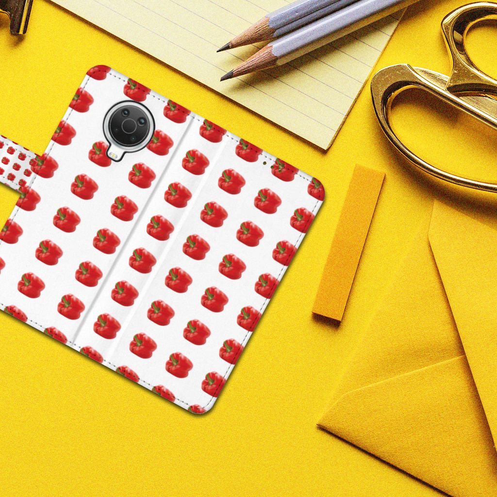 Er zit pit in jouw Nokia G10 | G20 Book Cover dankzij dit design met rode paprika’s. Paprika’s zijn er in allerlei kleuren en vormen en ze hebben gemeen dat ze heel erg gezond zijn. De rode paprika’s op deze case staan op een grijs met witte geblokte achtergrond en vormen een opvallende verschijning. Heb jij ooit iemand in je nabije omgeving rond zien lopen met een design hoesje met rode paprika’s? Waarschijnlijk niet. Dit boekhoesje met rode paprika’s beschermt jouw telefoon aan alle zijden en beschikt over verschillende opbergvakjes voor pasjes en briefgeld. De case sluit perfect af met het magnetische lipje aan de buitenkant. Zeker weten dat je met dit hoesje met rode paprika’s een smartphone accessoire te pakken hebt waarmee je jezelf in de schijnwerpers zet. De houder aan de binnenzijde van het boekhoesje met rode paprika’s is van TPU. Als je andere kleuren paprika’s op je hoesje wilt, raden we je aan ons assortiment design hoesjes te bekijken of zelf een hoesje te ontwerpen.