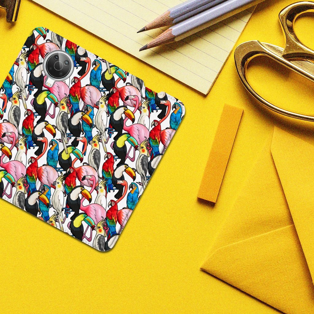 Dit exotische hoesje vol prachtige vogels is een genot voor het oog. Dankzij de felgekleurde toekans, papegaaien, flamingo’s en kaketoes op dit design word je meteen vrolijk als je naar dit hoesje kijkt. Je waant je meteen in de tropen met dit bonte gezelschap tegen een witte achtergrond. Het ontwerp staat op een Hoesje maken voor de Nokia G10 | G20. Dit populaire smartphonehoesje met het beton-design heeft één vakje voor een pasje of briefgeld en is aan alle zijden bedrukt. Met de standcase zet je je telefoon gemakkelijk neer, zodat je je handen vrij hebt als je bijvoorbeeld een video wilt kijken. De binnenkant van de standcase is van grijs PU-leer. Dat is fijn, omdat je daardoor niet snel vlekken ziet op je hoesje.