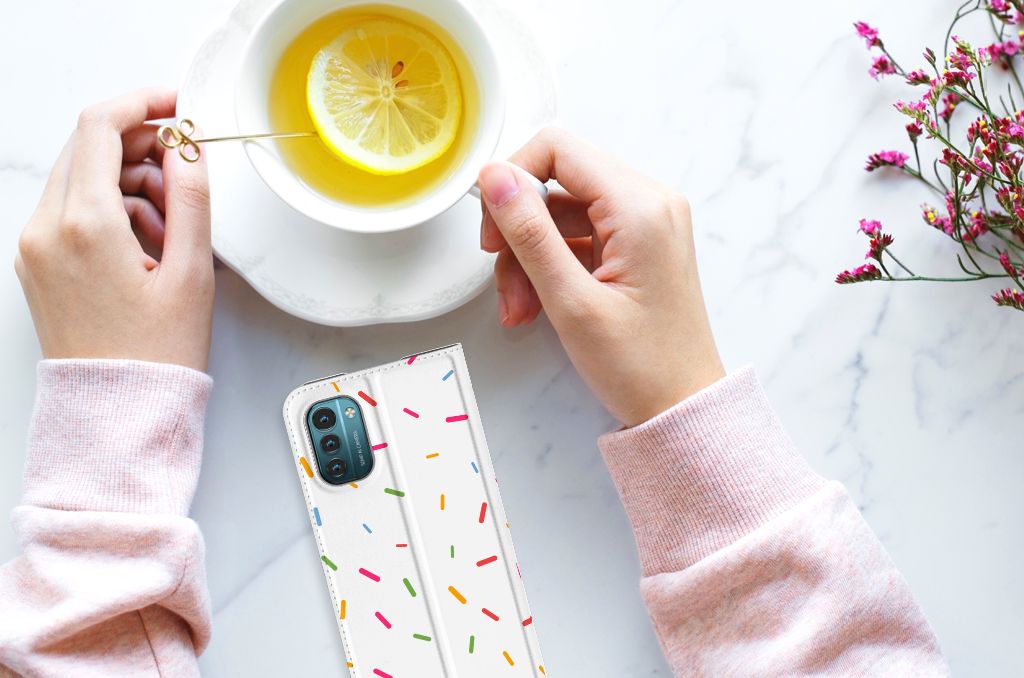 De cartoon met Donut op dit design hoesje geeft jouw smartphone een grappige en vrolijke uitstraling. De Nokia G11 | G21 Flip Style Cover zorgt ervoor dat je je schouders op zult halen als je telefoon een keer op de grond valt. Omdat er geen schade zal optreden kun jij je weg weer heel makkelijk vervolgen. De grappige Donut Care stand case is een zeer populair product. Allereerst is het nergens anders te krijgen. Het design is namelijk van de hand van onze eigen ontwerper. Daarnaast zal de case jouw smartphone aan alle zijden beschermen. Ook heeft het Donut Care hoesje een vakje aan de binnenzijde en een speciale standaard. Ook kun je je eigen unieke hoesje ontwerpen, met eigen cartoons, foto’s en teksten. De houder aan de binnenzijde van de Donut Care case is van TPU, de buitenzijde van PU leer.