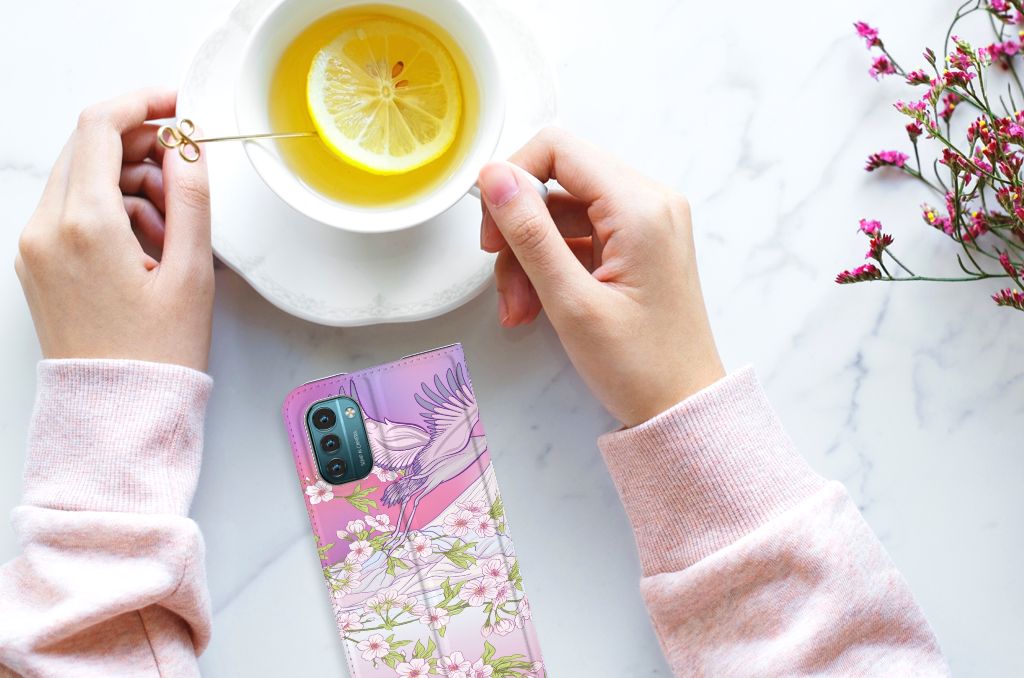 Met deze opvallende en kleurrijke Nokia G11 | G21 Hoesje maken met Bird Flying design blijft jouw toestel in uitzonderlijke staat. Een ooievaar fleurt al sinds mensenheugenis dorpen en steden op en doet dit ook met jouw stand case. Het design hoesje met deze reigerachtige vogel in roze en paarse kleuren is een zeer goede bescherming voor je telefoon. Het spetterende stand hoesje met opvallende ooievaar beschermt jouw telefoon aan alle zijden en beschikt over een opbergvakje voor een pasje of briefgeld. De roze met paarse case sluit perfect af met de magneet aan de binnenzijde. De houder aan de binnenzijde van het schitterende stand hoesje is van TPU. Dit is ook nog eens zeer flexibel materiaal. Het pu leer aan de buitenkant oogt zeer chique. Kijk voor andere dieren op een design hoesje binnen deze fraaie collectie. Ook kun je zelf een hoesje ontwerpen met je favoriete huisdier.