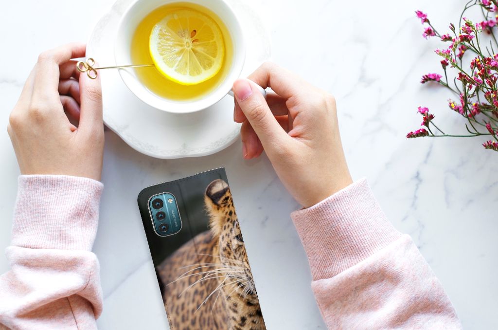 Het luipaard wordt ook wel een panter genoemd en is een sluwe kat. De bruingele vacht met een patroon van rozetachtige vlekken geeft een goede schutkleur. Dit zie je ook op een fraaie manier afgebeeld op dit super stoere hoesje. Mensen die indruk willen maken kopen deze stand case met design van het luipaard. Een Nokia G11 | G21 Hoesje maken is van alle markten thuis. Het is praktisch – vanwege onder meer het opbergvakje en de magnetische sluiting aan de binnenzijde – maar beschermt jouw smartphone tevens beter dan welke case ook. Het luipaard is sterk en behendig en misschien typeert jou dat ook wel. Dan past dit hoesje met luipaard uitstekend bij jou. De houder van TPU aan de binnenzijde is net zo sterk als het luipaard. Jouw telefoon is perfect beschermd. De case heeft tevens een standaard.