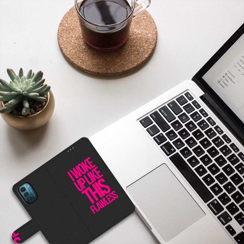 Met dit zwarte Nokia G11 | G21 Hoesje met naam met paarse tekst heb je een geweldige bescherming van je smartphone in handen. Dit zwarte hoesje met Woke Up tekst is een must voor jouw smartphone. Met dit design hoesje tekst val je ook zeker op. Je weet ook zeker dat het hoesje exclusief is. Het design is gemaakt door B2C Telecom. Het hoesje heeft verschillende vakjes en is aan alle zijden bedrukt. Ook het lipje aan de buitenkant kan worden bedrukt. De houder is van TPU, de buitenzijde van PU-leer. We willen je er ook op wijzen dat je zelf een hoesje kunt ontwerpen, met eigen beelden en teksten. Met onze Phone Case Designer kun je zelfs opvallende effecten, patronen en clip arts aan het ontwerp toevoegen.