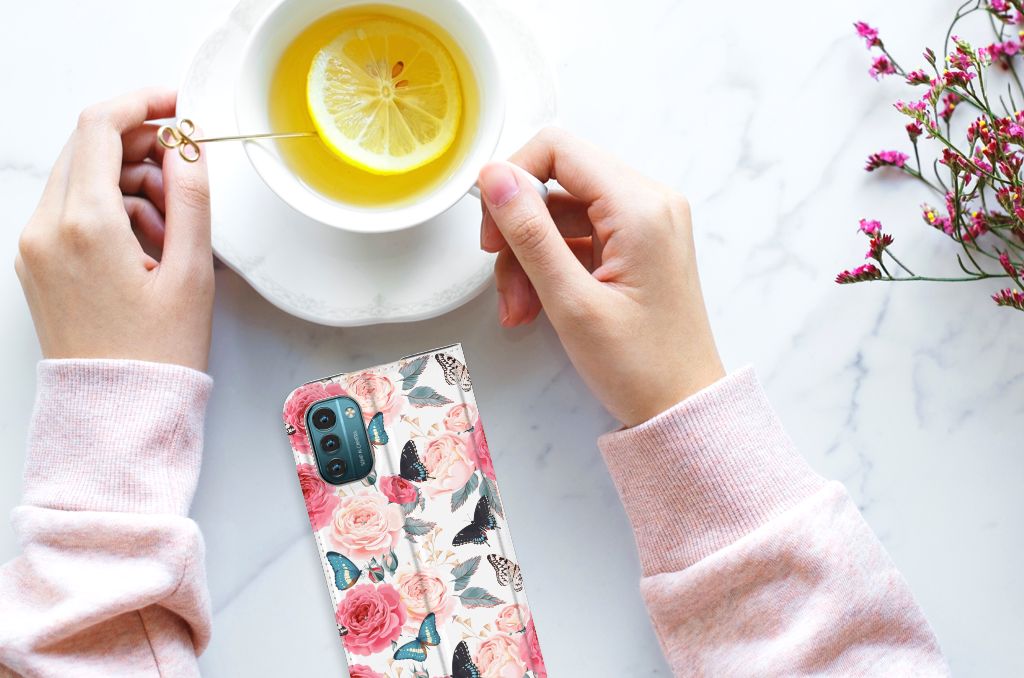 Ben je op zoek naar een uniek telefoonhoesje voor je Nokia G11 | G21? Dan ben je bij B2C Telecom aan het juiste adres! Speciaal voor jou hebben we dit prachtige Butterfly Roses design in onze collectie hoesjes opgenomen. Het design wordt bedrukt op een Smart Cover en heeft een vakje aan de binnenkant voor een pasje. Het fijne aan dit hoesje is dat je het als standaard neer kunt zetten. Hierdoor geniet je nog meer als je een filmpje aan het kijken bent op je telefoon. Het hoesje wordt afgesloten door magneten aan de binnenkant. Wil je dit design hoesje nog iets extra's geven? Voeg dan gratis je naam of een quote toe! Is dit design hoesje toch niet helemaal wat je zocht? Ontwerp dan zelf een hoesje in ons ontwerpprogramma.
