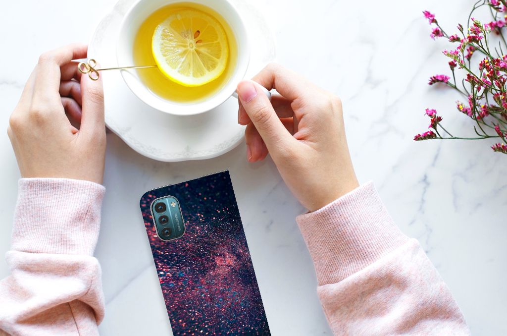 Je waant je in de zevende hemel met dit kunstzinnige, glitterachtige design hoesje met paarse en blauwe kleuren tegen een inktzwarte achtergrond. Het smartphone hoesje heeft ook een wat science fiction achtige allure. Met deze design Stars case zul je zeker opvallen. Als dit je bedoeling is, bestel dat snel dit waanzinnig mooie product voor je Nokia G11 | G21. Het telefoonhoesje is van alle gemakken voorzien en combineert een hele fraaie uitstraling met maximaal comfort. Bovendien is het gemaakt van zeer stevig en flexibel materiaal. Het unieke design, door B2C Telecom ontworpen, staat op een Stand Case. Deze case beschermt jouw telefoon aan alle kanten en beschikt over een 1 opbergvakje en een speciale standaard. Het hoesje wordt afgesloten met een magneet aan de binnenzijde. De houder aan de binnenzijde is van TPU.