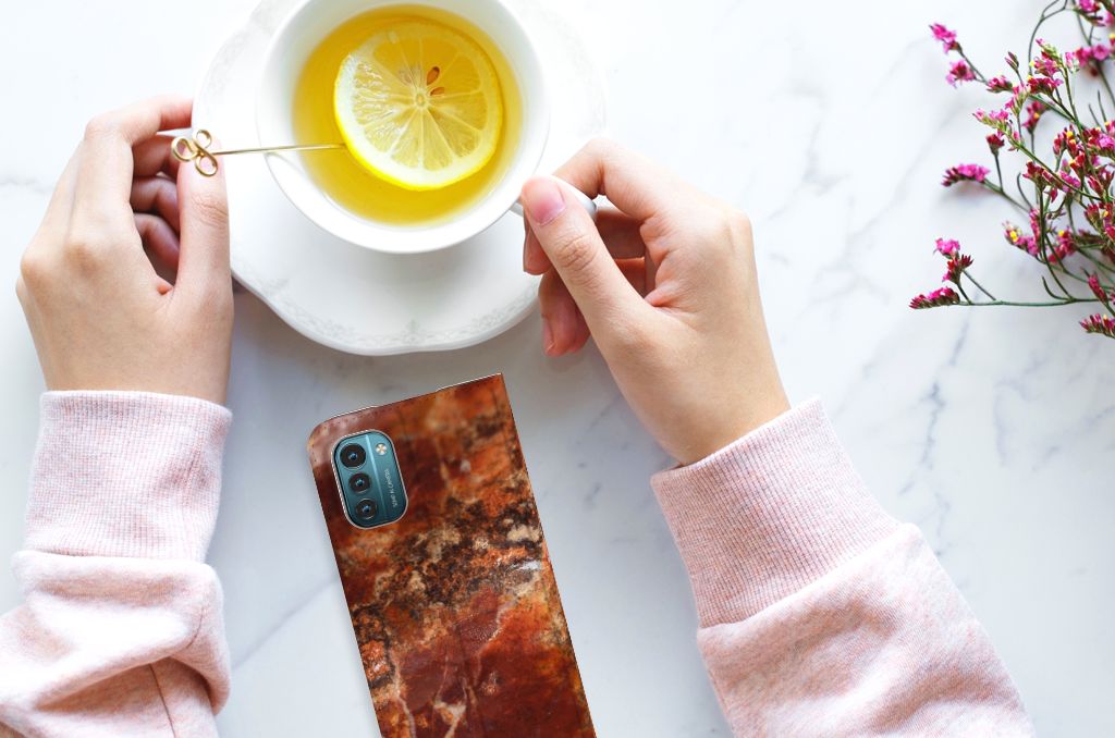 Dit design hoesje met Marmer Bruin is voor de artistieke personen onder ons. De Grieken en Romeinen wisten het al te waarderen door het als bouw- en bekledingsmateriaal toe te passen. Naast het witte Carrara marmer met haar zacht grijze geaderde belijning zijn de diverse soorten in een ruim kleurenpallet te krijgen. We hebben verschillende kleuren op design hoesjes gezet, zoals in dit geval bruin marmer. Dit is een Nokia G11 | G21 Standcase met marmer in bruine kleur. Het marmer wordt bedrukt op alle zijden van een stand case, die beschikt over 1 vakje voor een pasje en een magnetische sluiting aan de binnenkant. Verder heeft de case een houder van TPU. De rijkheid aan kleuren en varianties in afwerking geeft ontwerpers de vrijheid om met marmer hele mooie architectonische projecten te realiseren. Wij hebben onze ontwerper ook veel vrijheid gegeven. Het resultaat zie je terug in deze stand case met bruin marmer, dat de ideale bescherming voor jouw smartphone biedt.
