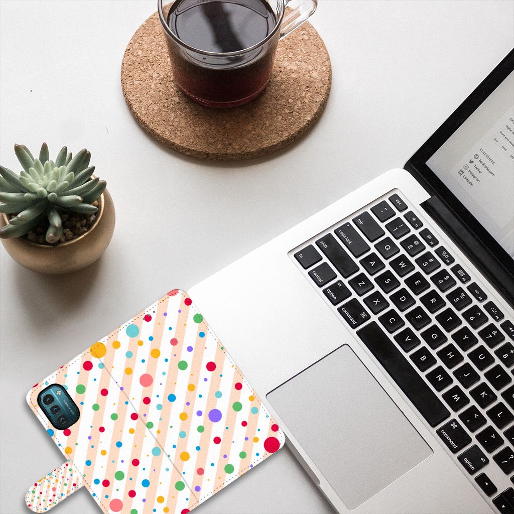Een Nokia G11 | G21 Telefoon Hoesje met verschillende kleuren stippen is een schitterende bescherming van jouw smartphone. Het boekhoesje met het design Dots in alle kleuren van de regenboog komt voor jou als geroepen. Maak je geen gebruik van dit zeer mooie hoesje, dan kan het met jouw smartphone een beetje beroerd aflopen. Dit mooie boekhoesje met verschillende kleuren stippen zorgt voor een volledige bescherming van je smartphone en wordt aan alle zijden bedrukt. Sommige stippen staan ook op het magnetische lipje aan de buitenzijde. Verder is de houder aan de binnenzijde van TPU. Jouw telefoon is dus zeer goed opgeborgen en kan geen kant op. Met een hoesje met stippen in verschillende kleuren op alle zijden blijft jouw telefoon volledig in tact. Heb je liever een boekhoesje met stippen in andere opvallende kleuren? Ontwerp dan zelf case met je eigen foto’s en teksten!