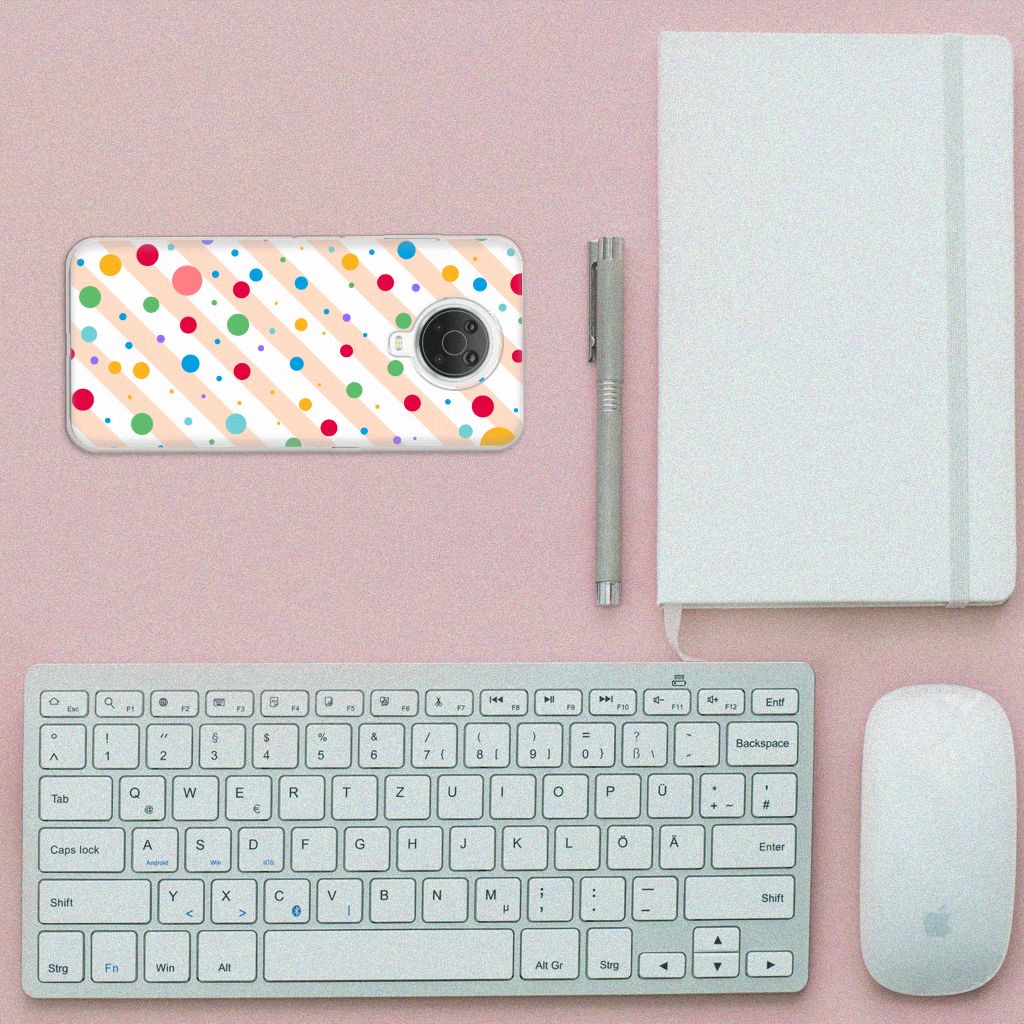 Een Nokia G20 | G10 TPU bumper met verschillende kleuren stippen is een schitterende bescherming van jouw smartphone. De tpu case met het design Dots in alle kleuren van de regenboog komt voor jou als geroepen. Maak je geen gebruik van dit zeer mooie hoesje, dan kan het met jouw smartphone een beetje beroerd aflopen. Deze mooie tpu case met verschillende soorten klompen in verschillende kleuren is zo’n beetje de meest flexibele case die er bestaat. Het hoesje met stippen zorgt voor een goede bescherming van je smartphone, vooral aan de achterzijde en zijkanten. Met een tpu hoesje met stippen in verschillende kleuren blijft jouw gsm volledig in tact. Heb je liever een tpu case met stippen in andere opvallende kleuren? Ontwerp dan zelf een tpu case met je eigen foto’s en teksten! De case wordt aan de achterzijde bedrukt met klompen, de zijkanten blijven doorzichtig.