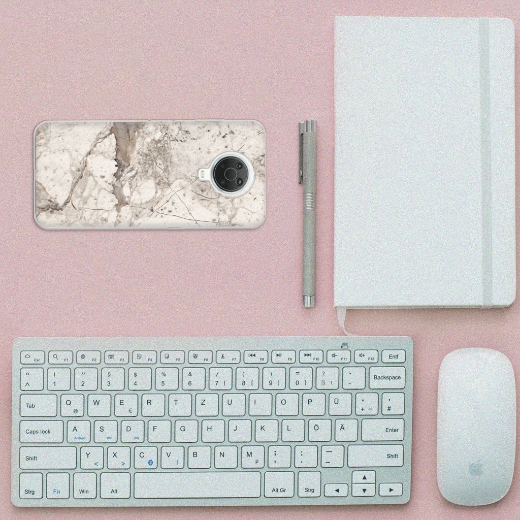 Dit design hoesje met Marmer Beige is voor de artistieke personen onder ons. De Grieken en Romeinen wisten het steen al te waarderen door het als bouw- en bekledingsmateriaal toe te passen. Naast het witte Carrara marmer met haar zacht grijze geaderde belijning zijn de diverse marmersoorten in een ruim kleurenpallet te krijgen. We hebben verschillende kleuren op design hoesjes gezet, zoals in dit geval beige marmer. Dit is een Nokia G20 | G10 TPU Siliconen Hoesje met marmer in beige kleur. Het marmer wordt bedrukt op de voorkant van een tpu case, die beschikt over opstaande randen aan de voorkant en goed combineert met een screenprotector. De rijkheid aan kleuren en varianties in afwerking geeft designers de vrijheid om met marmer hele mooie architectonische projecten te realiseren. Wij hebben onze designer ook veel vrijheid gegeven. Het resultaat zie je terug in deze tpu case met beige marmer, die jouw smartphone goed beschermt. De zijkanten van de case worden niet bedrukt met marmer.