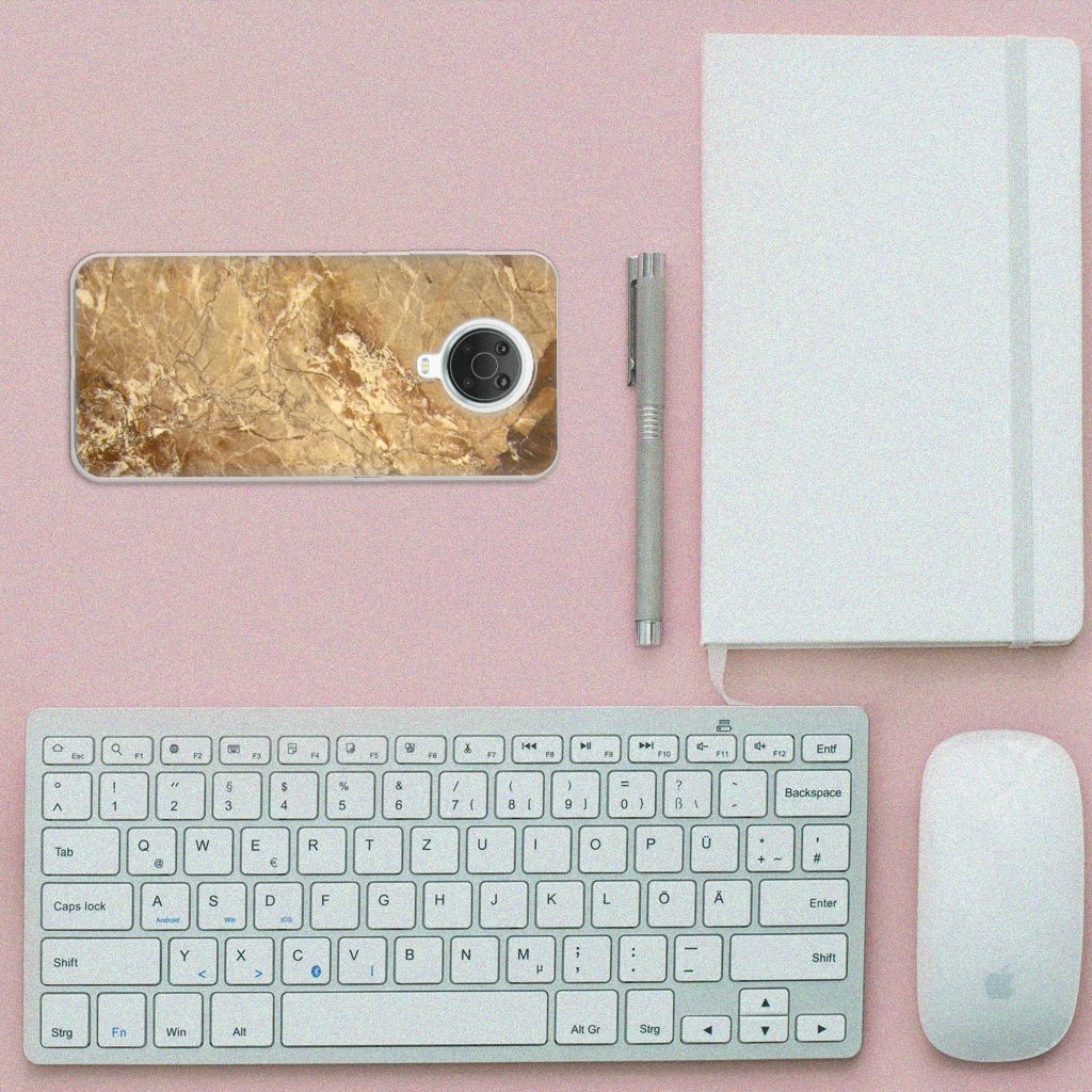 Dit design hoesje met Marmer in lichtbruine kleur is voor de artistiekelingen onder ons. De Grieken en Romeinen wisten het marmer al te waarderen door het in de bouw toe te passen. Naast het witte marmer zijn de diverse soorten marmer in een gevarieerde kleurensamenstelling te krijgen. We hebben verschillende mooie kleuren op design hoesjes gezet, zoals in dit geval het lichtbruine marmer. Dit is een Nokia G20 | G10 TPU Siliconen Hoesje met marmer in lichtbruine kleur. Het marmer wordt bedrukt op de voorkant van een tpu case, die beschikt over opstaande randen aan de voorkant en heel goed combineert met een screenprotector van glas of van folie. Door de rijkdom aan kleuren en varianties in afwerking kunnen ontwerpers met marmer schitterende architectonische projecten realiseren. Wij hebben hetzelfde gedaan en onze ontwerper veel vrijheid geboden. Het resultaat zie je terug in deze tpu case met lichtbruin marmer, die jouw smartphone goed beschermt. De zijkanten van de case worden niet bedrukt met het lichtbruine marmer.