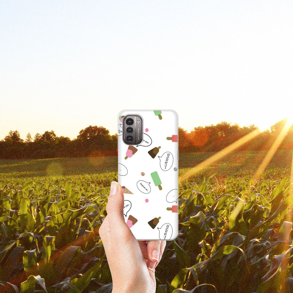 Van deze vrolijke Nokia G21 | G11 Siliconen Case met daarop verschillende soorten ijsjes met tekstwolkjes krijg je sowieso een vrij en zomers gevoel. De zomer komt naar je toe met deze print van ijsjes met tekstwolkjes. Ben je op het strand, dan ontbreekt een lekker ijsje natuurlijk niet. Net zoals je je smartphone bij de hand hebt, met daaromheen een design hoesje met bijzondere ijsjes en tekstwolkjes. Jouw telefoon kan dan de bescherming in de vorm van een tpu hoesje met ijsjes zeer goed gebruiken. De bovenkant van dit hoesje wordt bedrukt met ijsjes en tekstwolkjes, de zijkanten blijven doorzichtig. De case is gemaakt van schokabsorberend materiaal en past altijd in je broekzak. Onder alle weersomstandigheden zal deze TPU case perfect functioneren, ook in de zomer met een ijsje in je hand.