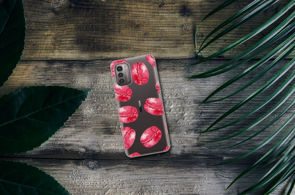 Dit tpu hoesje met Pink Macarons is een zeer opvallende bescherming voor jouw smartphone. Macarons zijn Franse koekjes: kleine, rond en luchtig. Ze worden in veel verschillende smaken gemaakt, herkenbaar aan de verschillende kleuren zoals chocolade (donkerbruin), mokka (middenbruin), kersen (rood), pistache (groen), aardbei (roze), framboos (karmijn). Deze kleuren kun je niet allemaal zien op dit fraaie design hoesje met roze macarons. Heb je altijd al een Nokia G21 | G11 Siliconen Case willen hebben met roze macarons? Grijp dan nu je kans. Deze case heeft zeer veel goede eigenschappen, zoals elastisch vermogen, flexibiliteit en schokbestendigheid. Dit design hoesje met roze macarons wordt aan de bovenkant bedrukt, de zijkanten blijven doorzichtig. De case heeft opstaande randen aan de voorzijde en beschermt samen met een screenprotector jouw telefoon perfect. De case heeft ook een handige standaard.