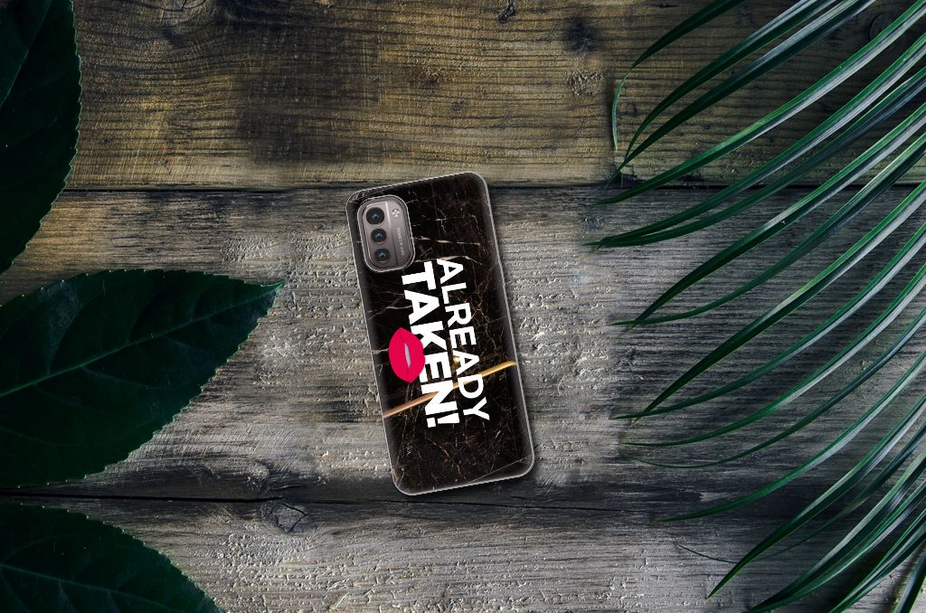Met deze Nokia G21 | G11 Siliconen hoesje met naam met Already Taken Black tekst maak je duidelijk dat jouw smartphone een kostbaar bezit is, waar je zeer lang over wilt beschikken. Je telefoon neem je waarschijnlijk vaak ter hand, dus dan zal de boodschap als je over dit hoesje beschikt zeker weten overkomen. De TPU case wordt alleen aan de bovenkant bedrukt en is zeer flexibel. De randen van het hoesje blijven transparant. Wil je een eigen tekst op je hoesje zetten? Dit kan ook, met onze Phone Case Designer. Deze unieke ontwerpmodule is ook geschikt om het design uit te breiden met foto’s, effecten en patronen.