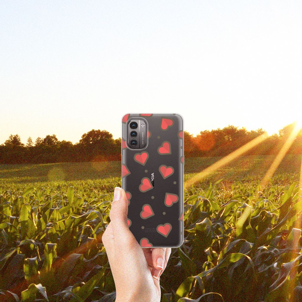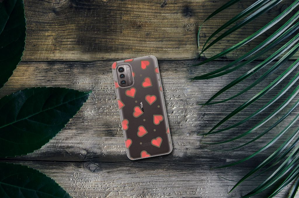 Met deze Nokia G21 | G11 TPU bumper met hartjes op een grijs met witte achtergrond maak jij een goede beurt als je dit cadeau geeft aan je vriend of vriendin. Bekroon je liefde voor elkaar met deze hele mooie tpu case, die jouw telefoon met name aan de achterkant en zijkanten goed beschermt. Dit is echt een prachtige manier om je telefoon te beschermen. Het tpu hoesje met design met Hearts is ook nog eens zeer praktisch, mede door het buigzame materiaal en de uitsparingen. Als je telefoon met het TPU hoesje uit je hand valt, stuitert het als het ware meteen weer terug in je hand en zal het scherm in tact blijven. De case heeft namelijk opstaande randen aan de voorkant. Alleen de bovenkant van de case wordt bedrukt met hartjes, de zijkanten zijn doorzichtig. Voor een habbekrats is dit hoesje met hartjes op een grijs met witte achtergrond te bestellen.