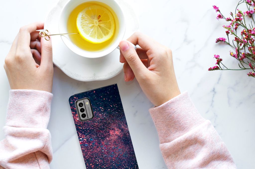Je waant je in de zevende hemel met dit kunstzinnige, glitterachtige design hoesje met paarse en blauwe kleuren tegen een inktzwarte achtergrond. Het smartphone hoesje heeft ook een wat science fiction achtige allure. Met deze design Stars case zul je zeker opvallen. Als dit je bedoeling is, bestel dat snel dit waanzinnig mooie product voor je Nokia G22. Het telefoonhoesje is van alle gemakken voorzien en combineert een hele fraaie uitstraling met maximaal comfort. Bovendien is het gemaakt van zeer stevig en flexibel materiaal. Het unieke design, door B2C Telecom ontworpen, staat op een Stand Case. Deze case beschermt jouw telefoon aan alle kanten en beschikt over een 1 opbergvakje en een speciale standaard. Het hoesje wordt afgesloten met een magneet aan de binnenzijde. De houder aan de binnenzijde is van TPU.