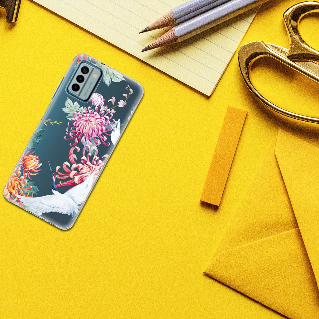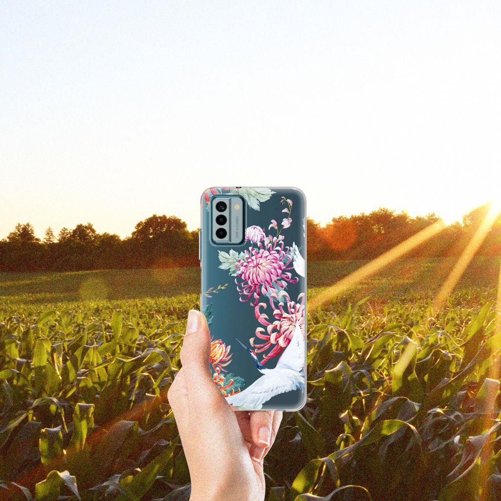 Verspreid over de hele wereld leven 19 soorten ooievaars. De spanwijdte – dat is de afstand van vleugeltip tot vleugeltip – van een volwassen ooievaar kan 2.50 meter bedragen. De gebieden waarin de ooievaar broedt, liggen in heel Europa, het Midden-Oosten, West- en Centraal-Azië en Noordwest-Afrika. Het ideale leefgebied van de ooievaar is een half open tot open landschap met veel afwisseling in grondgebruik en begroeiing. De begroeiing op dit design hoesje, in allerlei verschillende kleuren, zal niet alleen voor de ooievaars fraai zijn. Jij zult er zelf ook heel vrolijk van worden. Het in het oog springende design staat op een TPU Hoesje. Dit telefoonhoesje wordt alleen aan de bovenkant bedrukt en is zeer flexibel. De randen van het hoesje blijven transparant en worden niet bedrukt. Met dit hoesje past jouw Nokia G22 altijd in je broekzak.
