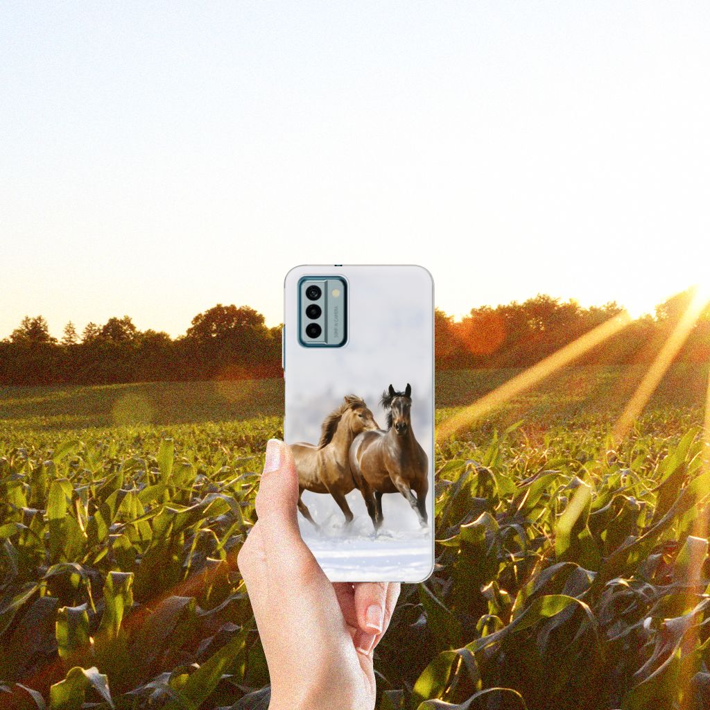 Voor de paardenliefhebbers onder ons hebben we onze collectie uitgebreid met dit design hoesje met print van paarden. Vroeger hield de mens vooral werkpaarden, inmiddels hebben we vriendschap gesloten met het paard. Vandaar dat het ook een favoriet dier is op onze smartphonehoesjes, zoals deze tpu case. Een TPU Hoesje voor de Nokia G22 met Paarden is niet alleen super mooi en chique, maar ook nog eens zeer flexibel. Verder is de case schokabsorberend en heeft het opstaande randen. Zie je liever je eigen paard terug op een hoesje. Dat kan! Door zelf een uniek hoesje te ontwerpen, met eigen foto’s en teksten. De TPU case wordt aan de bovenzijde bedrukt, de zijkanten blijven transparant.