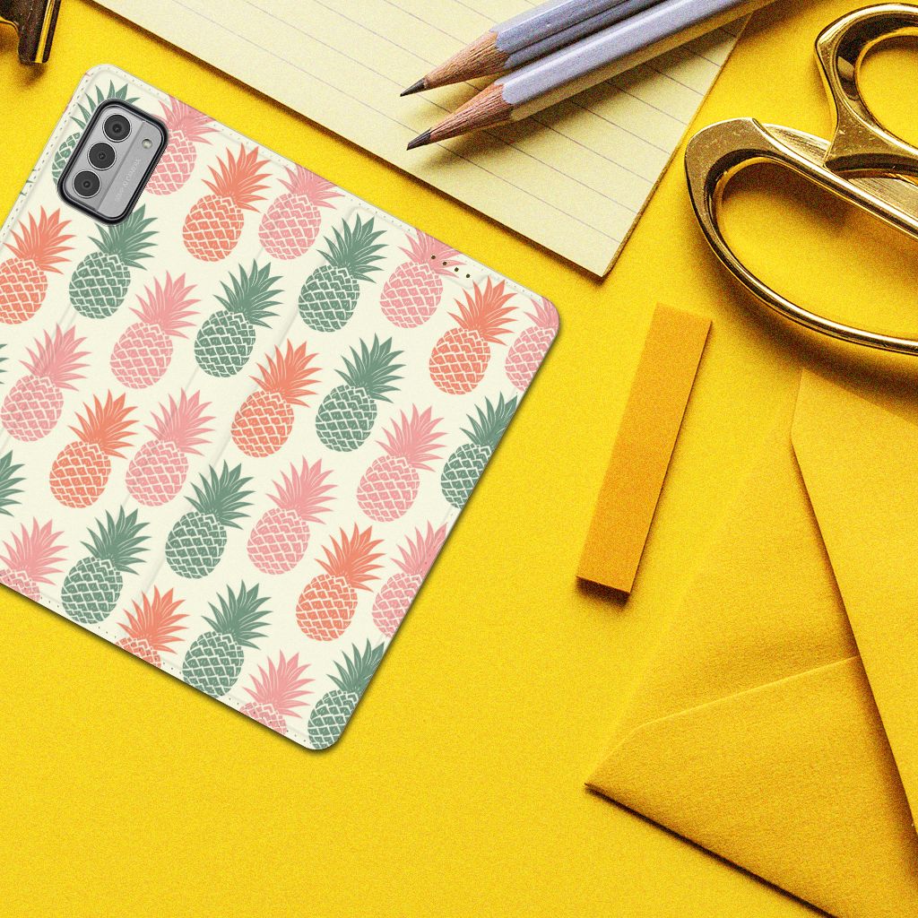 Ananas is een woord uit het Tupi, de taal van de Tupi-indianen, en betekent uitmuntende vrucht. Dit fruit van zeer hoge kwaliteit staat op onze superieure boekhoesjes, stand cases, hard cases en TPU cases. Jij blijft er gezond uitzien als je zo nu en dan een hap neemt van een Ananas , jouw smartphone blijft tip top in orde als je er een leuk telefoonhoesje omheen doet. Een ananas heeft stevig, veerkrachtig vruchtvlees. Een beetje te vergelijken met het TPU in onze hoesjes. TPU is elastisch materiaal, dat zeer buigzaam is. Vandaar dat het zeer schokbestendig is. Het ananas design staat op een stand case. Deze Nokia G42 Flip Style Cover beschermt jouw telefoon aan alle kanten en beschikt over een 1 opbergvakje en een speciale standaard. Het hoesje wordt afgesloten met een magneet aan de binnenzijde. De houder aan de binnenzijde is van TPU.