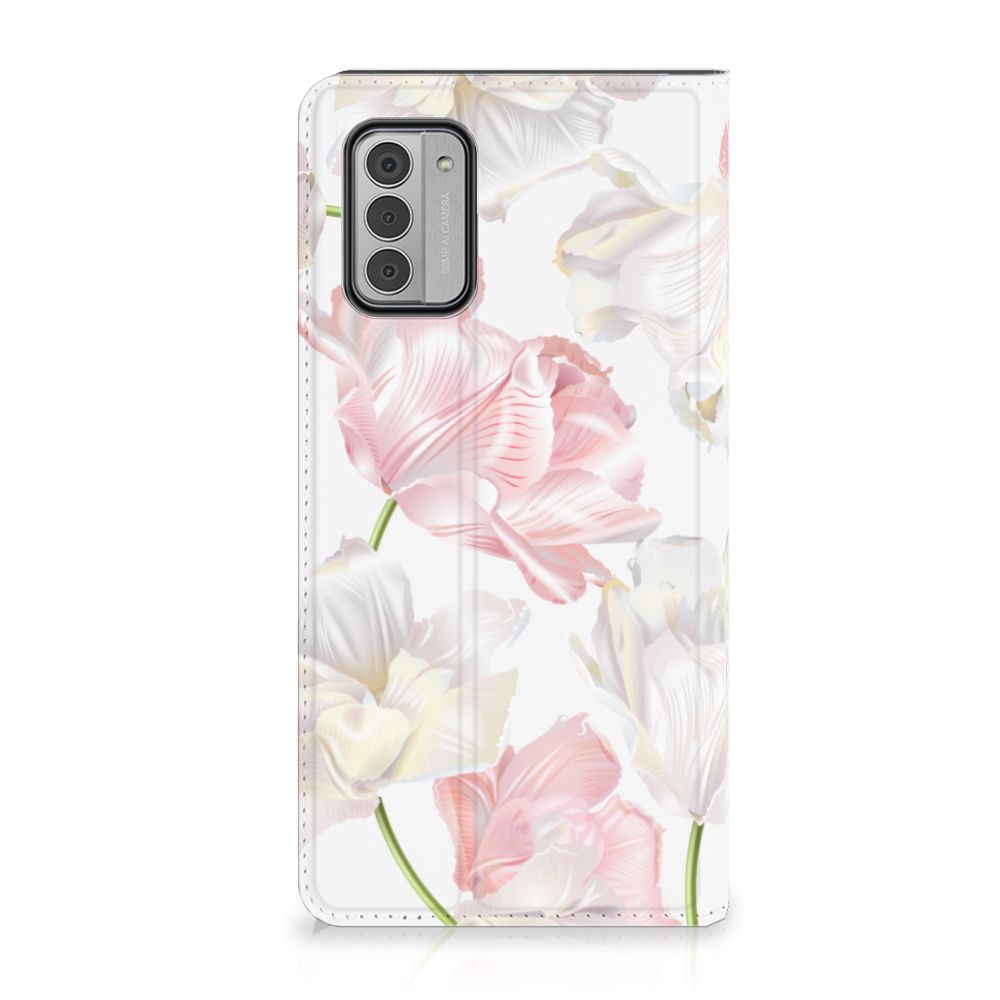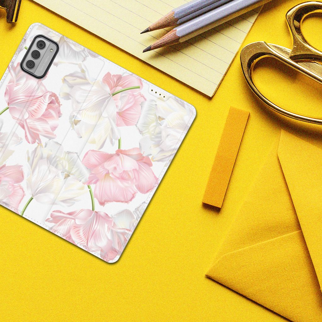 Een bosje bloemen doet een mens (en zijn smartphone) goed. De witte en roze bloemen op dit Nokia G42 Smart Cover geven jouw smartphone een zeer mooie uitstraling. Je wordt er ook meteen een stuk rustiger van als je aan het appen of aan het bellen bent. Valt dan je telefoon op de grond, dan zal er dankzij de stand case met het design Lovely Flowers ontstaan. Onze stand cases met roze en witte bloemen zien er zeer prettig uit en zijn heel praktisch, wat blijkt uit onder meer het vakje aan de binnenkant en de handige standaard waarmee je de smartphone rechtop op tafel neer kunt zetten. De roze en witte bloemen passen goed op alle zijden van de case. Op deze stand case van leer en TPU (houder aan de binnenkant) kun je trouwens ook je eigen bloemige ontwerp zetten. In een paar simpele stappen maak je zelf een stand hoesje met daarop jouw mooiste bloemen.