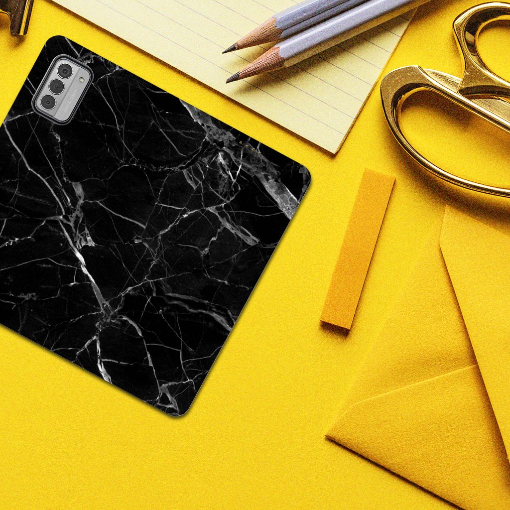 Dit design hoesje met Marmer Zwart is voor de artistieke personen onder ons. De Grieken en Romeinen wisten het materiaal al te waarderen door het in de bouw toe te passen. Naast het witte marmer met haar zacht grijze geaderde belijning zijn de diverse soorten in een gevarieerd kleurenpallet te krijgen. We hebben mooie kleuren op design hoesjes gezet, zoals in dit geval zwart marmer. Dit is een Nokia G42 Standcase met marmer in zwarte kleur. Het marmer wordt bedrukt op alle zijden van een stand case, die beschikt over 1 vakje voor een pasje en een magnetische sluiting aan de binnenzijde. Verder heeft de hoes een houder van TPU. De rijkdom aan kleuren en varianties in afwerking geeft ontwerpers de vrijheid om met marmer hele mooie architectonische projecten te realiseren. Wij hebben onze ontwerper tevens veel vrijheid gegeven. Het resultaat zie je terug in deze stand case met zwart marmer, dat de ideale bescherming voor jouw smartphone biedt.