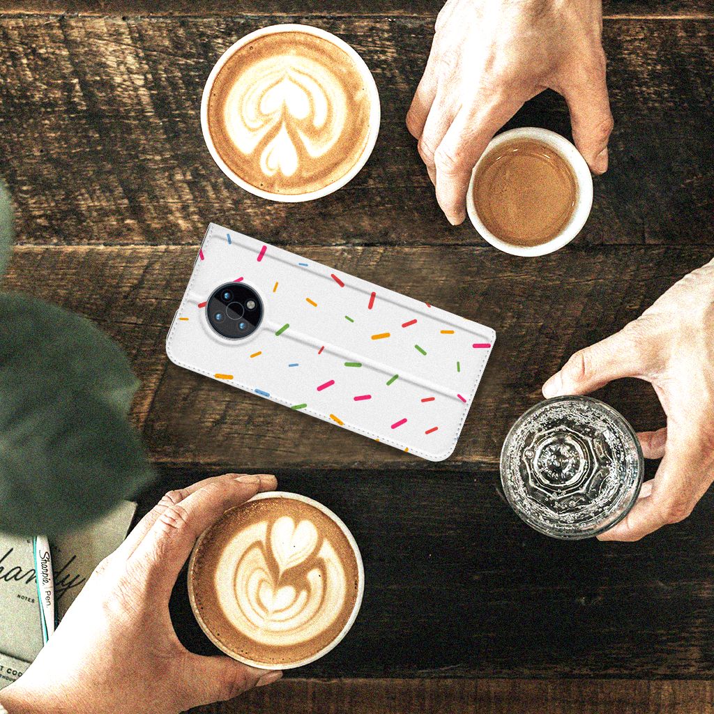 De cartoon met Donut op dit design hoesje geeft jouw smartphone een grappige en vrolijke uitstraling. De Nokia G50 Flip Style Cover zorgt ervoor dat je je schouders op zult halen als je telefoon een keer op de grond valt. Omdat er geen schade zal optreden kun jij je weg weer heel makkelijk vervolgen. De grappige Donut Care stand case is een zeer populair product. Allereerst is het nergens anders te krijgen. Het design is namelijk van de hand van onze eigen ontwerper. Daarnaast zal de case jouw smartphone aan alle zijden beschermen. Ook heeft het Donut Care hoesje een vakje aan de binnenzijde en een speciale standaard. Ook kun je je eigen unieke hoesje ontwerpen, met eigen cartoons, foto’s en teksten. De houder aan de binnenzijde van de Donut Care case is van TPU, de buitenzijde van PU leer.
