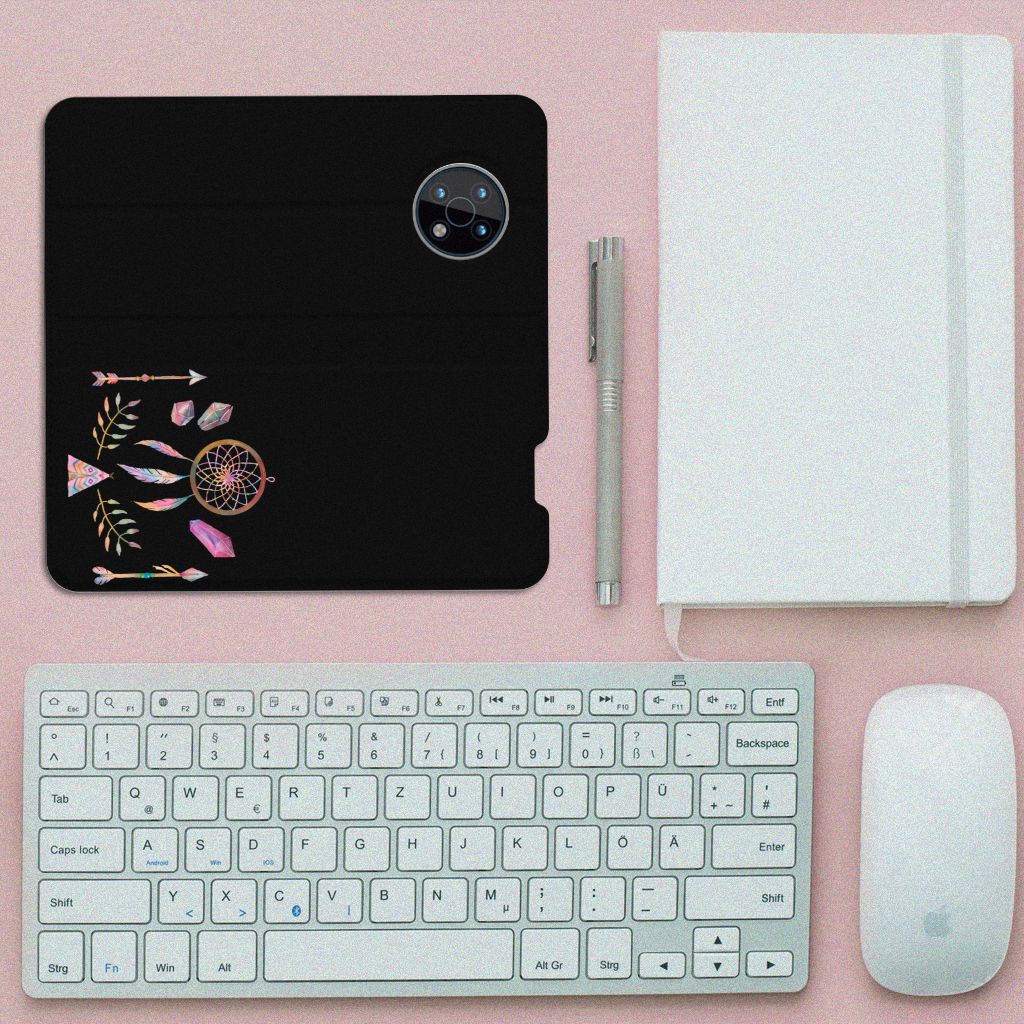 Een dromenvanger werd lang geleden al door een indianenvolk in Noord-Amerika gebruikt om nare dromen te weren. Nu nog hangen mensen over de hele wereld dromenvangers boven hun bed. Maar ook op een telefoonhoesje staat zo’n boho dreamcatcher heel mooi. Dit mooie design dat bestaat uit een tipi, pijlen en dromenvanger heeft veel verschillende prachtige kleuren. Maar omdat het ontwerp minimalistisch en klein is, is het design toch subtiel te noemen. Dit ontwerp staat op een Magnet Case voor je Nokia G50. Dit populaire smartphonehoesje heeft één vakje voor een pasje of briefgeld en is aan alle zijden bedrukt. Met de standcase zet je je telefoon gemakkelijk neer, zodat je je handen vrij hebt als je bijvoorbeeld een video wilt kijken. De binnenkant van de standcase is van grijs PU-leer. Dat is fijn, omdat je daardoor niet snel vlekken ziet op je hoesje.