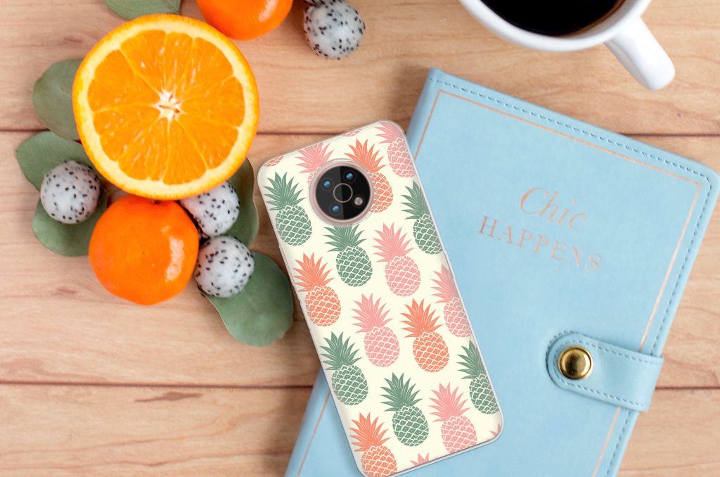 Ananas is een woord uit het Tupi, de taal van de Tupi-indianen, en betekent uitmuntende vrucht. Dit fruit van zeer hoge kwaliteit staat op onze superieure boekhoesjes, stand cases, hard cases en TPU cases. Jij blijft er gezond uitzien als je zo nu en dan een hap neemt van een Ananas , jouw smartphone blijft tip top in orde als je er een leuk telefoonhoesje omheen doet. Een ananas heeft stevig, veerkrachtig vruchtvlees. Een beetje te vergelijken met het TPU in onze hoesjes. TPU is elastisch materiaal, dat zeer buigzaam is. Vandaar dat het zeer schokbestendig is. Het ananas design staat op een staat op een TPU case. Deze Nokia G50 Siliconen Case wordt alleen aan de bovenkant bedrukt en is zeer flexibel. De randen van het hoesje blijven transparant.