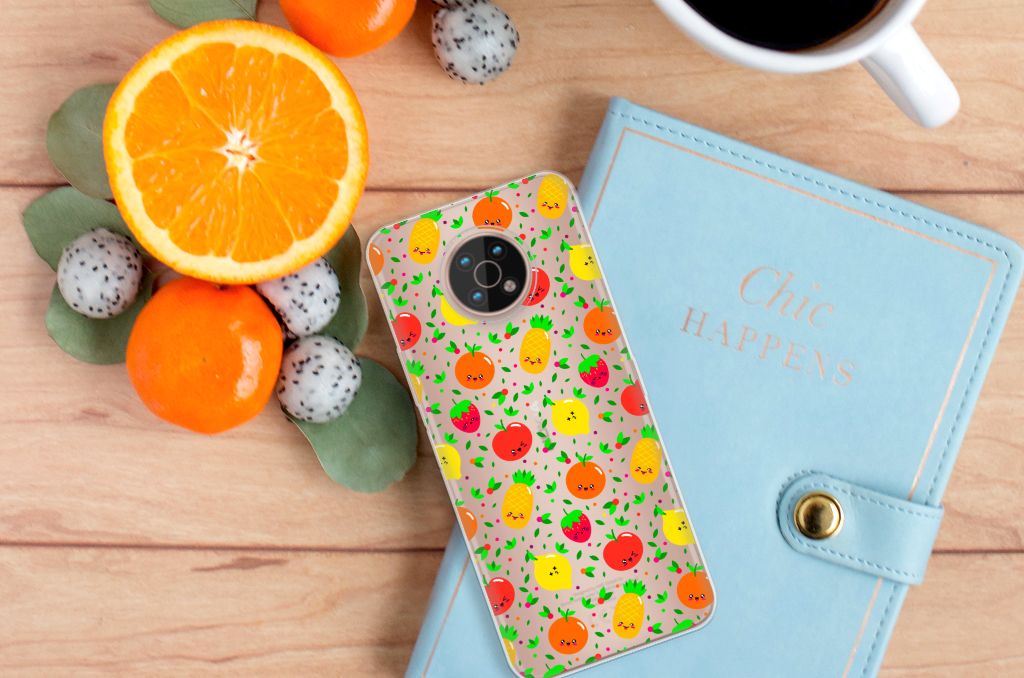 Een fris, fruitig en vrolijk hoesje, deze case met afbeeldingen van aardbeien, ananassen, appels, sinaasappels en citroenen. Minstens twee stuks fruit per dag wordt aanbevolen als dagelijkse hoeveelheid voor de mens. Dit verkleint de kans op allerlei ziekten. Dus met het aantal stukken fruit op de Nokia G50 Siliconen Case zou je wel een maandje zoet moeten zijn. Met het hoesje zelf kun je je hele leven doen, dit is namelijk niet stuk te krijgen. Dit komt door het sterke en flexibele materiaal waarvan het gemaakt is. De vrolijk stemmende case het desing Fruits maakt jouw telefoon dus zeer duurzaam. Zorg ervoor dat jouw smartphone gezond blijft en kies voor dit hoesje met frivool fruit. Een tpu case met fruit wordt alleen aan de bovenkant bedrukt en is zeer flexibel. De randen van het hoesje blijven transparant en worden niet bedrukt met het fruit.
