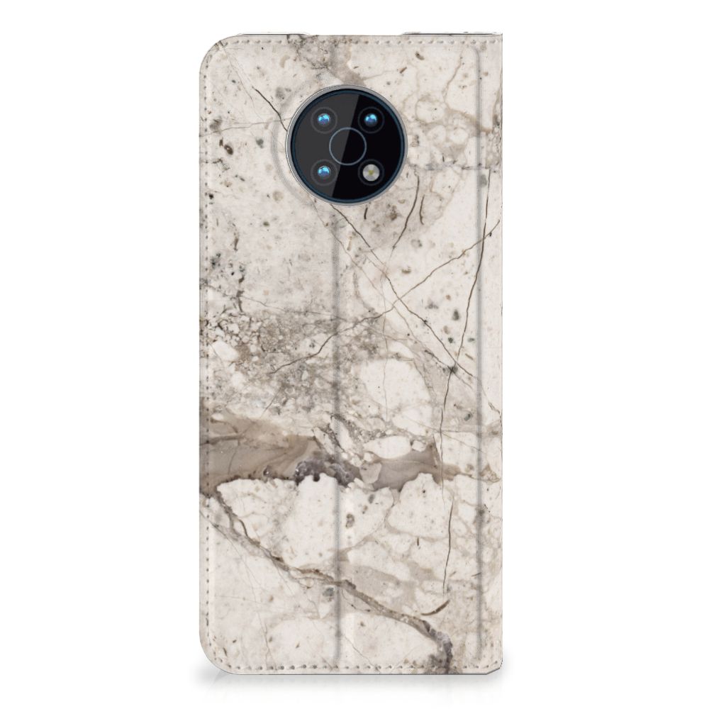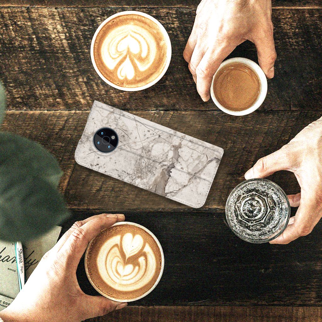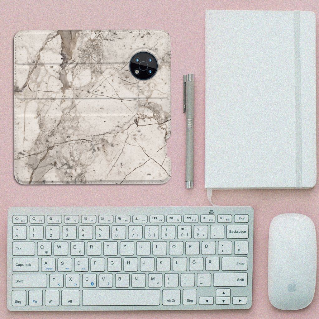 Dit design hoesje met Marmer Beige is voor de artistieke personen onder ons. De Grieken en Romeinen wisten het steen al te waarderen door het als bouw- en bekledingsmateriaal toe te passen. Naast het witte Carrara marmer met haar zacht grijze geaderde belijning zijn de diverse marmersoorten in een ruim kleurenpallet te krijgen. We hebben verschillende kleuren op design hoesjes gezet, zoals in dit geval beige marmer. Dit is een Nokia G50 Standcase met marmer in beige kleur. Het marmer wordt bedrukt op alle zijden van een stand case, die beschikt over 1 vakje voor een pasje en toebehoren en een magnetische sluiting aan de binnenkant. Verder heeft de case een houder van TPU. De rijkheid aan kleuren en varianties in afwerking geeft designers de vrijheid om met marmer hele mooie architectonische projecten te realiseren. Wij hebben onze designer ook veel vrijheid gegeven. Het resultaat zie je terug in deze stand case met beige marmer, dat de ideale bescherming voor jouw smartphone biedt.