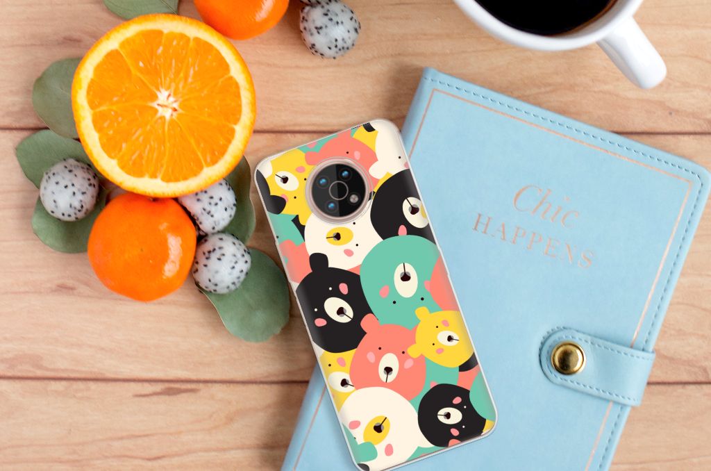 Op dit hoesje vind je een bereschattig ontwerp! Vergeef ons de woordgrap, maar hoe moeten we dit lieve ontwerp anders omschrijven? Op dit knuffelige ontwerp zie je leuke, getekende beertjes in vrolijke kleuren als geel, blauw en roze. Dankzij de contrasterende witte en zwarte beertjes vallen de felle kleurtjes nog meer op. Al met al is dit Telefoonhoesje met Naam voor de Nokia G50 een perfect hoesje voor de knuffelberen onder ons. TPU is flexibel en onbreekbaar. Zo is je telefoon aan de achterkant en de randen heel goed beschermd. De case met het Bears-design is aan de bovenkant bedrukt, de randen blijven transparant. Het TPU-hoesje is perfect te combineren met een screenprotector, zo zijn je telefoon en je beeldscherm perfect beschermd.