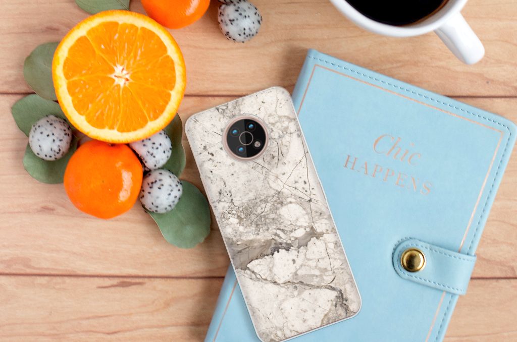 Dit design hoesje met Marmer Beige is voor de artistieke personen onder ons. De Grieken en Romeinen wisten het steen al te waarderen door het als bouw- en bekledingsmateriaal toe te passen. Naast het witte Carrara marmer met haar zacht grijze geaderde belijning zijn de diverse marmersoorten in een ruim kleurenpallet te krijgen. We hebben verschillende kleuren op design hoesjes gezet, zoals in dit geval beige marmer. Dit is een Nokia G50 TPU Siliconen Hoesje met marmer in beige kleur. Het marmer wordt bedrukt op de voorkant van een tpu case, die beschikt over opstaande randen aan de voorkant en goed combineert met een screenprotector. De rijkheid aan kleuren en varianties in afwerking geeft designers de vrijheid om met marmer hele mooie architectonische projecten te realiseren. Wij hebben onze designer ook veel vrijheid gegeven. Het resultaat zie je terug in deze tpu case met beige marmer, die jouw smartphone goed beschermt. De zijkanten van de case worden niet bedrukt met marmer.