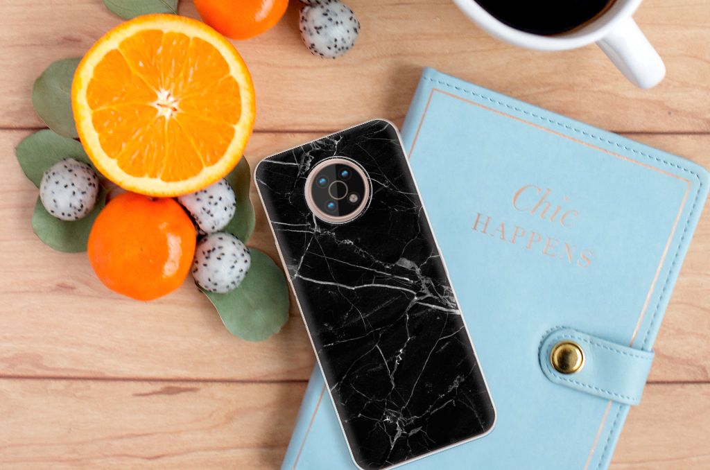 Dit design hoesje met Marmer Zwart is voor de artistieke personen onder ons. De Grieken en Romeinen wisten het materiaal al te waarderen door het in de bouw toe te passen. Naast het witte marmer met haar zacht grijze geaderde belijning zijn de diverse soorten in een gevarieerd kleurenpallet te krijgen. We hebben mooie kleuren op design hoesjes gezet, zoals in dit geval zwart marmer. Dit is een Nokia G50 TPU Siliconen Hoesje met marmer in bruine kleur. Het marmer wordt bedrukt op de voorkant van een tpu case, die beschikt over opstaande randen aan de voorkant en heel goed combineert met een screenprotector van glas of van folie. De rijkdom aan kleuren en varianties in afwerking geeft ontwerpers de vrijheid om met marmer hele mooie architectonische projecten te realiseren. Wij hebben onze designer tevens veel vrijheid gegeven. Het resultaat zie je terug in deze tpu case met zwart marmer, die jouw smartphone goed beschermt. De zijkanten van de case worden niet bedrukt met het zwarte marmer.