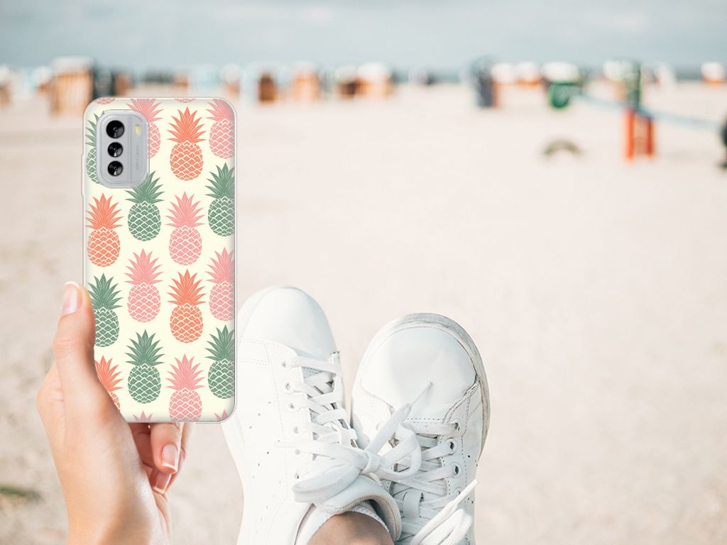 Ananas is een woord uit het Tupi, de taal van de Tupi-indianen, en betekent uitmuntende vrucht. Dit fruit van zeer hoge kwaliteit staat op onze superieure boekhoesjes, stand cases, hard cases en TPU cases. Jij blijft er gezond uitzien als je zo nu en dan een hap neemt van een Ananas , jouw smartphone blijft tip top in orde als je er een leuk telefoonhoesje omheen doet. Een ananas heeft stevig, veerkrachtig vruchtvlees. Een beetje te vergelijken met het TPU in onze hoesjes. TPU is elastisch materiaal, dat zeer buigzaam is. Vandaar dat het zeer schokbestendig is. Het ananas design staat op een staat op een TPU case. Deze Nokia G60 Siliconen Case wordt alleen aan de bovenkant bedrukt en is zeer flexibel. De randen van het hoesje blijven transparant.