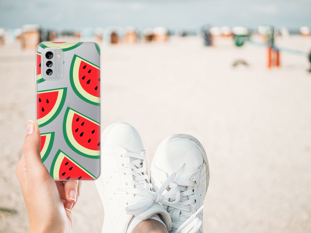 Watermeloenen zijn uitstekende dorstlessers, misschien dat je daarom juist in de zomermaanden extra enthousiast raakt van dit design hoesje Watermelons. Jij blijft gezond als je zo nu en dan een watermeloen neemt, jouw smartphone blijft in tact als je er deze Nokia G60 Siliconen Case omheen doet. Deze tpu case wordt alleen aan de bovenkant bedrukt met watermeloenen is zeer flexibel. De randen van het hoesje blijven transparant. Je kunt ook kiezen voor andere soorten fruit op je hoesje. Kijk maar eens naar onze andere design hoesjes op onze website.