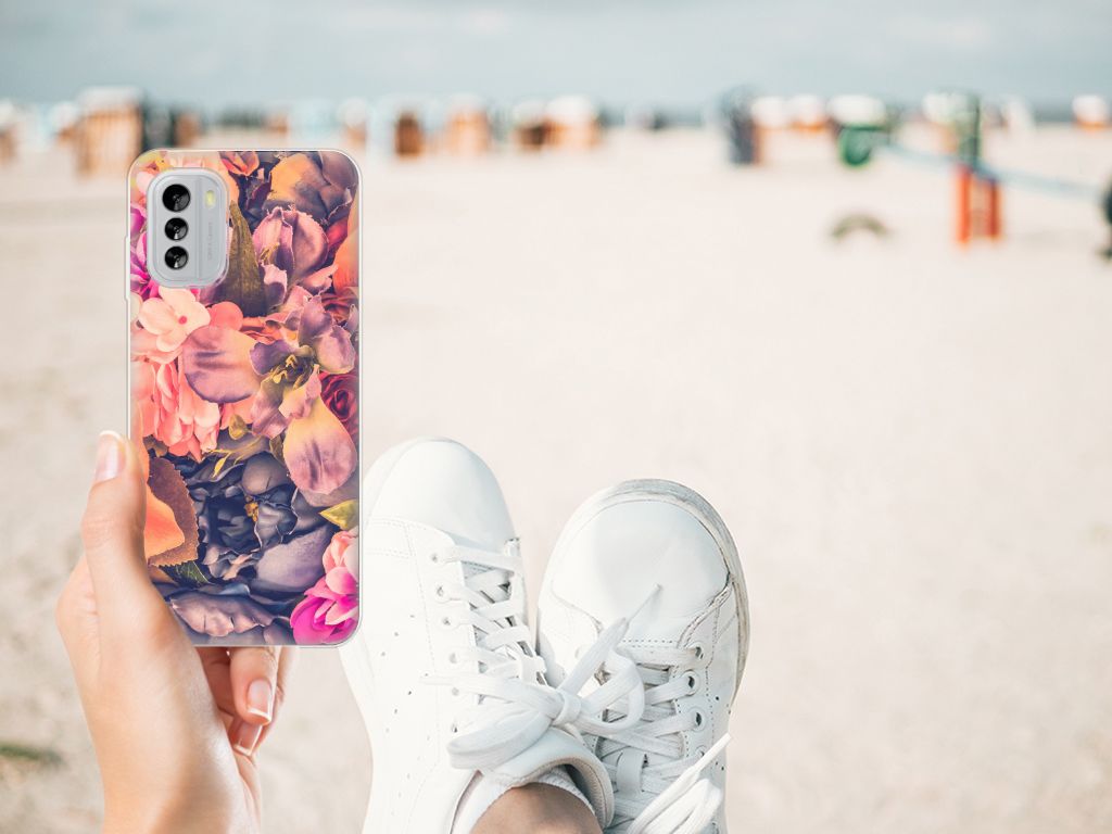 Dit Bosje Bloemen doet een mens en zijn smartphone goed. De oranje, paarse en roze bloemen op deze Nokia G60 TPU Case geven jouw smartphone een zeer sierlijke uitstraling. Je wordt er ook meteen vrolijker van als je aan het appen, mailen of aan het bellen bent. Valt dan je telefoon op de grond, dan zal er dankzij de tpu case met oranje, paarse en roze bloemen geen schade ontstaan. Helemaal niet als je er een screenprotector bij hebt gekocht. Onze tpu cases met oranje, paarse en roze bloemen zien er zeer prettig uit en zijn heel praktisch, getuige onder meer de opstaande randen en het flexibele materiaal. Alleen de achterkant van de tpu case wordt bedrukt met oranje, paarse en roze bloemen. Op deze tpu case is het ook mogelijk je eigen ontwerp te zetten. In no time ontwerp je zelf een tpu case met daarop foto’s van jouw favoriete bloemen.