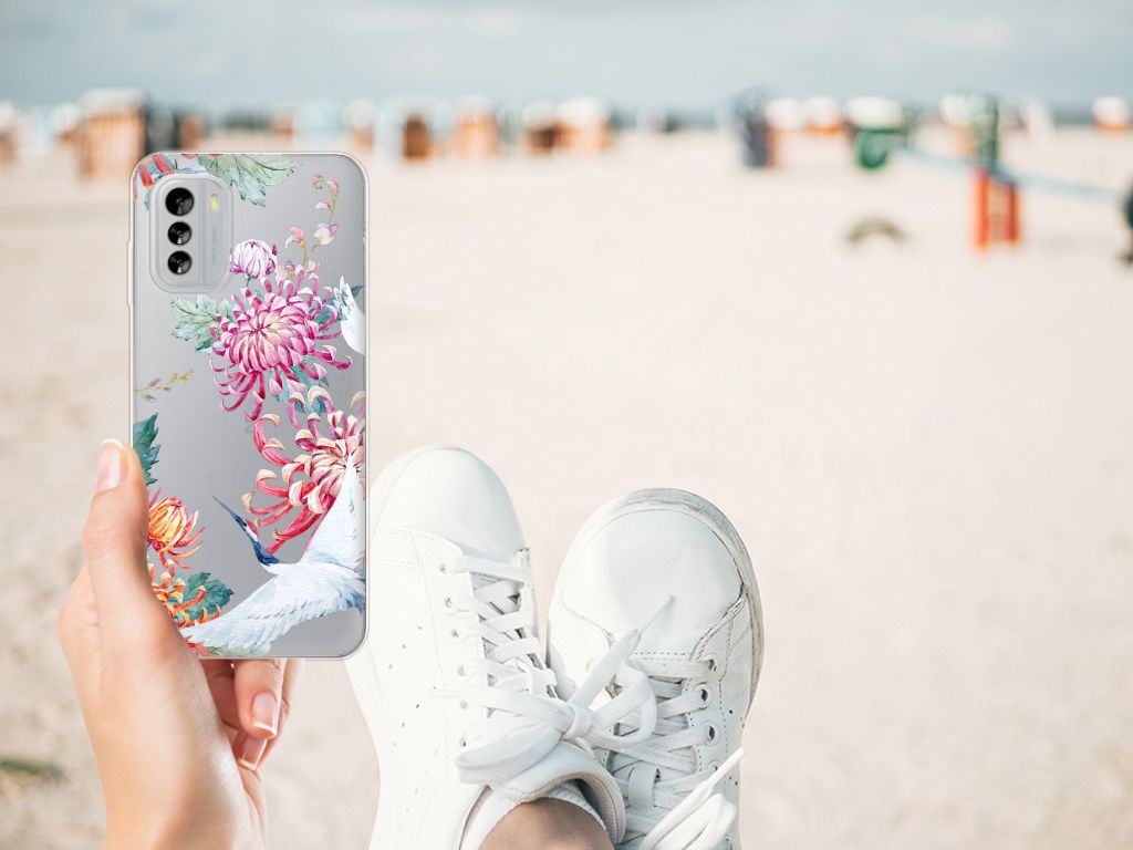 Verspreid over de hele wereld leven 19 soorten ooievaars. De spanwijdte – dat is de afstand van vleugeltip tot vleugeltip – van een volwassen ooievaar kan 2.50 meter bedragen. De gebieden waarin de ooievaar broedt, liggen in heel Europa, het Midden-Oosten, West- en Centraal-Azië en Noordwest-Afrika. Het ideale leefgebied van de ooievaar is een half open tot open landschap met veel afwisseling in grondgebruik en begroeiing. De begroeiing op dit design hoesje, in allerlei verschillende kleuren, zal niet alleen voor de ooievaars fraai zijn. Jij zult er zelf ook heel vrolijk van worden. Het in het oog springende design staat op een TPU Hoesje. Dit telefoonhoesje wordt alleen aan de bovenkant bedrukt en is zeer flexibel. De randen van het hoesje blijven transparant en worden niet bedrukt. Met dit hoesje past jouw Nokia G60 altijd in je broekzak.