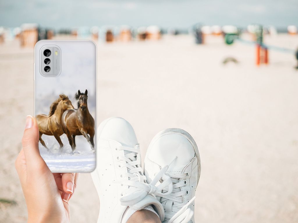 Voor de paardenliefhebbers onder ons hebben we onze collectie uitgebreid met dit design hoesje met print van paarden. Vroeger hield de mens vooral werkpaarden, inmiddels hebben we vriendschap gesloten met het paard. Vandaar dat het ook een favoriet dier is op onze smartphonehoesjes, zoals deze tpu case. Een TPU Hoesje voor de Nokia G60 met Paarden is niet alleen super mooi en chique, maar ook nog eens zeer flexibel. Verder is de case schokabsorberend en heeft het opstaande randen. Zie je liever je eigen paard terug op een hoesje. Dat kan! Door zelf een uniek hoesje te ontwerpen, met eigen foto’s en teksten. De TPU case wordt aan de bovenzijde bedrukt, de zijkanten blijven transparant.