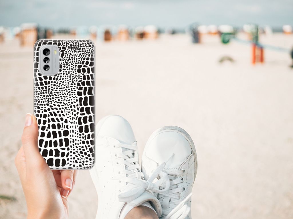 Deze tpu case met zwarte en witte Slangenprint kunnen wij zeer exclusief noemen. Zeker als je er nog een bijzondere tekst van jezelf aan toevoegt, zoals je eigen naam in een sierletter. Jouw tpu case krijgt dan een persoonlijke uitstraling, net nog een beetje specialer dan dit hoesje met zwarte en witte slangenprint. Wat niets afdoet van de exclusiviteit van deze tpu case met zwarte en witte slangenprint. Ben jij toe aan een stoer en opvallend Nokia G60 TPU Hoesje? Pak dan dit design met print van slangenhuid als basis. Het tpu hoesje is zeer flexibel en wordt alleen aan de bovenzijde bedrukt. De randen van dit flexibele hoesje blijven doorzichtig. Jij bent ervan verzekerd dat jouw smartphone tegen een stootje kan met dit tpu hoesje met zwarte en witte slangenprint.