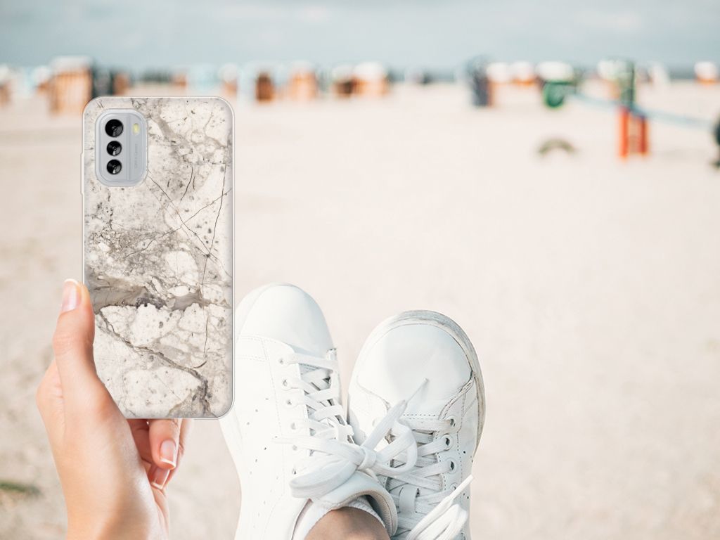 Dit design hoesje met Marmer Beige is voor de artistieke personen onder ons. De Grieken en Romeinen wisten het steen al te waarderen door het als bouw- en bekledingsmateriaal toe te passen. Naast het witte Carrara marmer met haar zacht grijze geaderde belijning zijn de diverse marmersoorten in een ruim kleurenpallet te krijgen. We hebben verschillende kleuren op design hoesjes gezet, zoals in dit geval beige marmer. Dit is een Nokia G60 TPU Siliconen Hoesje met marmer in beige kleur. Het marmer wordt bedrukt op de voorkant van een tpu case, die beschikt over opstaande randen aan de voorkant en goed combineert met een screenprotector. De rijkheid aan kleuren en varianties in afwerking geeft designers de vrijheid om met marmer hele mooie architectonische projecten te realiseren. Wij hebben onze designer ook veel vrijheid gegeven. Het resultaat zie je terug in deze tpu case met beige marmer, die jouw smartphone goed beschermt. De zijkanten van de case worden niet bedrukt met marmer.