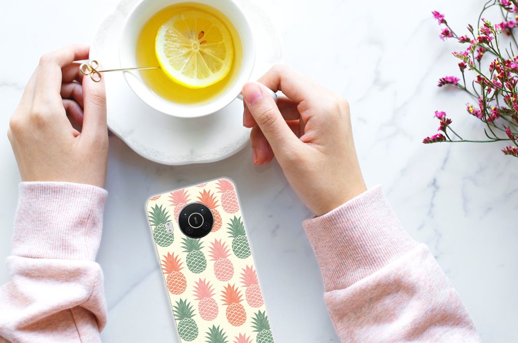 Ananas is een woord uit het Tupi, de taal van de Tupi-indianen, en betekent uitmuntende vrucht. Dit fruit van zeer hoge kwaliteit staat op onze superieure boekhoesjes, stand cases, hard cases en TPU cases. Jij blijft er gezond uitzien als je zo nu en dan een hap neemt van een Ananas , jouw smartphone blijft tip top in orde als je er een leuk telefoonhoesje omheen doet. Een ananas heeft stevig, veerkrachtig vruchtvlees. Een beetje te vergelijken met het TPU in onze hoesjes. TPU is elastisch materiaal, dat zeer buigzaam is. Vandaar dat het zeer schokbestendig is. Het ananas design staat op een staat op een TPU case. Deze Nokia X10 | X20 Siliconen Case wordt alleen aan de bovenkant bedrukt en is zeer flexibel. De randen van het hoesje blijven transparant.