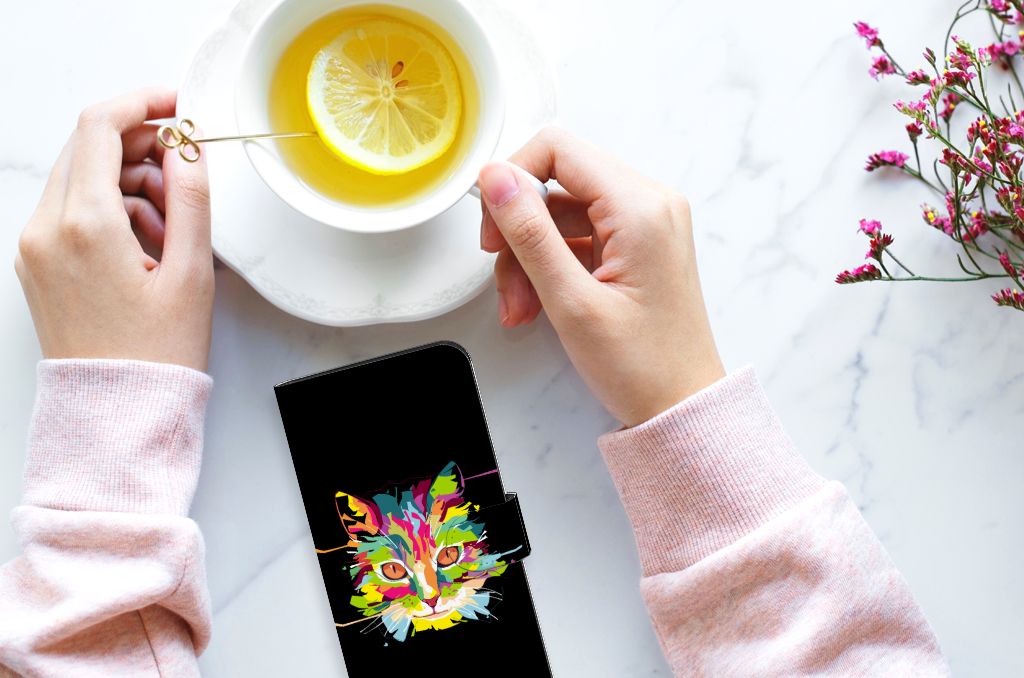 Als jij van katten houdt en op zoek bent naar een uniek hoesje, dan is dit het hoesje wat je wilt hebben. Op de voorkant van dit Leuk Hoesje vind je namelijk een mooie afbeelding van een kat in alle kleuren van de regenboog op een zwarte klassieke achtergrond. Naast dat het een mooi hoesje betreft, is het ook nog eens ontzettend handig. Zo kun je in deze bookcase wel twee á drie pasjes en briefgeld kwijt. Hiermee kun je jouw belangrijkste bezittingen op een plek bewaren in het boekhoesje en kun je jouw portemonnee voortaan thuislaten. Een bookcase heeft daarnaast ook nog het voordeel dat jouw telefoon aan alle zijdes wordt beschermd in dit leuke hoesje, dubbel zo handig dus!