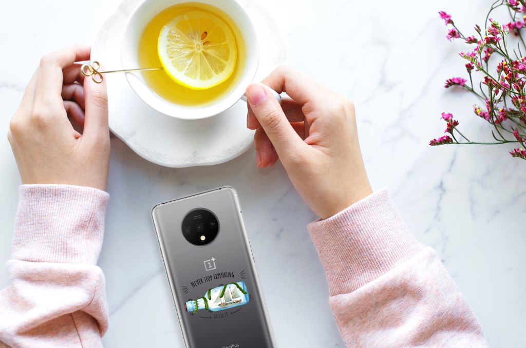 Dit leuke design met een schip in een fles is voor de echte avonturier of reiziger. Dankzij de tekst ‘Never stop exploring: Go for it’ word je altijd herinnerd aan het feit dat het volgende avontuur weer op de loer ligt! Dit design staat op een Telefoonhoesje met Naam voor je OnePlus 7T. TPU is flexibel en heel erg sterk. Zo is je telefoon aan de achterkant en de randen heel goed beschermd. De case is aan de bovenkant bedrukt, de randen blijven transparant. Het TPU-hoesje is perfect te combineren met een screenprotector, zo zijn je telefoon en je beeldscherm altijd goed beschermd.