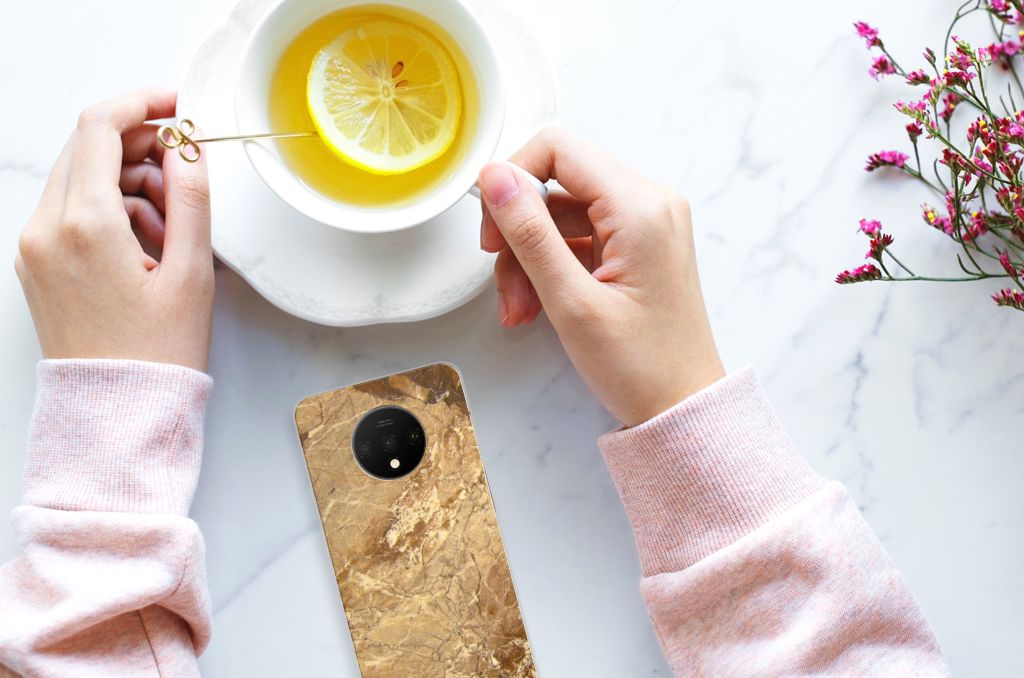 Dit design hoesje met Marmer in lichtbruine kleur is voor de artistiekelingen onder ons. De Grieken en Romeinen wisten het marmer al te waarderen door het in de bouw toe te passen. Naast het witte marmer zijn de diverse soorten marmer in een gevarieerde kleurensamenstelling te krijgen. We hebben verschillende mooie kleuren op design hoesjes gezet, zoals in dit geval het lichtbruine marmer. Dit is een OnePlus 7T TPU Siliconen Hoesje met marmer in lichtbruine kleur. Het marmer wordt bedrukt op de voorkant van een tpu case, die beschikt over opstaande randen aan de voorkant en heel goed combineert met een screenprotector van glas of van folie. Door de rijkdom aan kleuren en varianties in afwerking kunnen ontwerpers met marmer schitterende architectonische projecten realiseren. Wij hebben hetzelfde gedaan en onze ontwerper veel vrijheid geboden. Het resultaat zie je terug in deze tpu case met lichtbruin marmer, die jouw smartphone goed beschermt. De zijkanten van de case worden niet bedrukt met het lichtbruine marmer.