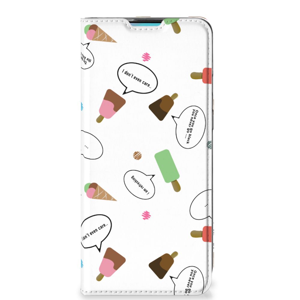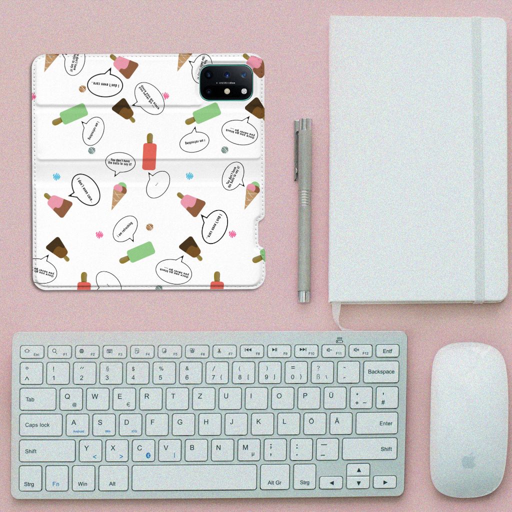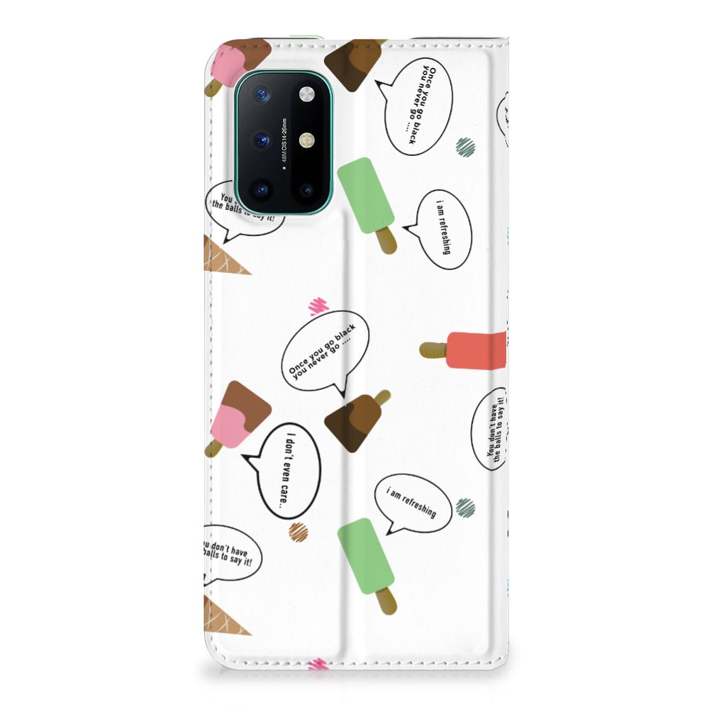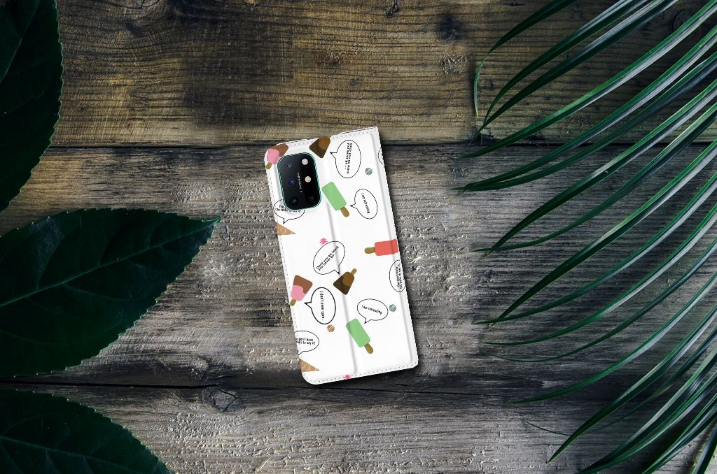 Van deze vrolijke OnePlus 8T Flip Style Cover met daarop verschillende soorten ijsjes met tekstwolkjes krijg je sowieso een vrij en zomers gevoel. De zomer komt naar je toe met deze print van ijsjes met tekstwolkjes. Ben je op het strand, dan ontbreekt een lekker ijsje natuurlijk niet. Net zoals je je smartphone bij de hand hebt, met daaromheen een design hoesje met bijzondere ijsjes en tekstwolkjes. Jouw telefoon kan dan de bescherming in de vorm van een stand case met ijsjes zeer goed gebruiken. Alle zijden van dit hoesje worden bedrukt met ijsjes en dankzij de speciale standaard is het erg prettig om filmpjes te bekijken. De case wordt aan de binnenzijde met een magneet afgesloten en de houder aan de binnenzijde is van TPU. Onder alle weersomstandigheden zal deze case met 1 opbergvakje en ijsjes perfect functioneren, ook op het strand met een ijsje in je hand.