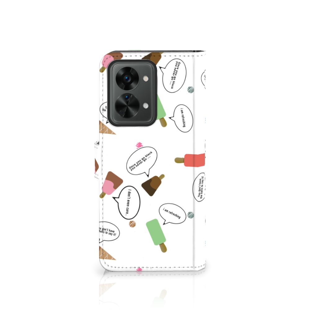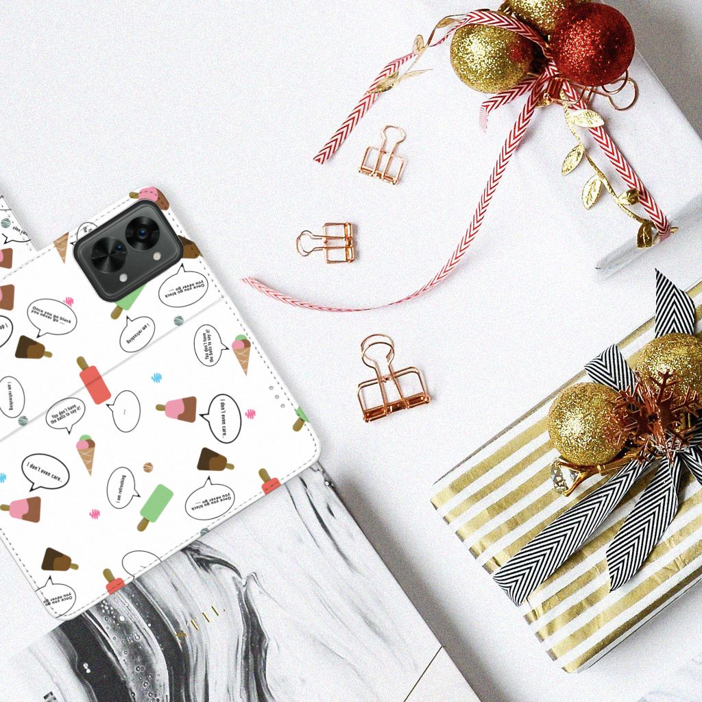 Van dit vrolijke OnePlus Nord 2T Book Cover met daarop verschillende soorten ijsjes met tekstwolkjes krijg je sowieso een vrij en zomers gevoel. De zomer komt naar je toe met deze print van ijsjes met tekstwolkjes. Ben je op het strand, dan ontbreekt een lekker ijsje natuurlijk niet. Net zoals je je smartphone bij de hand hebt, met daaromheen een design hoesje met bijzondere ijsjes en tekstwolkjes. Jouw telefoon kan dan de bescherming in de vorm van een boekhoesje met ijsjes zeer goed gebruiken. Alle zijden van dit hoesje worden bedrukt met ijsjes en tekstwolkjes. De case heeft een lipje aan de buitenzijde voor het afsluiten van de telefoon en de houder aan de binnenzijde is van TPU. Onder alle weersomstandigheden zal deze case met verschillende opbergvakjes perfect functioneren, ook op het strand met een ijsje in je hand.