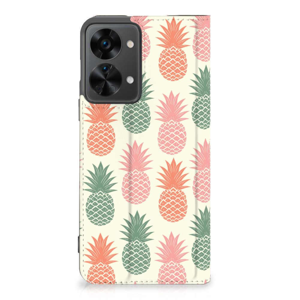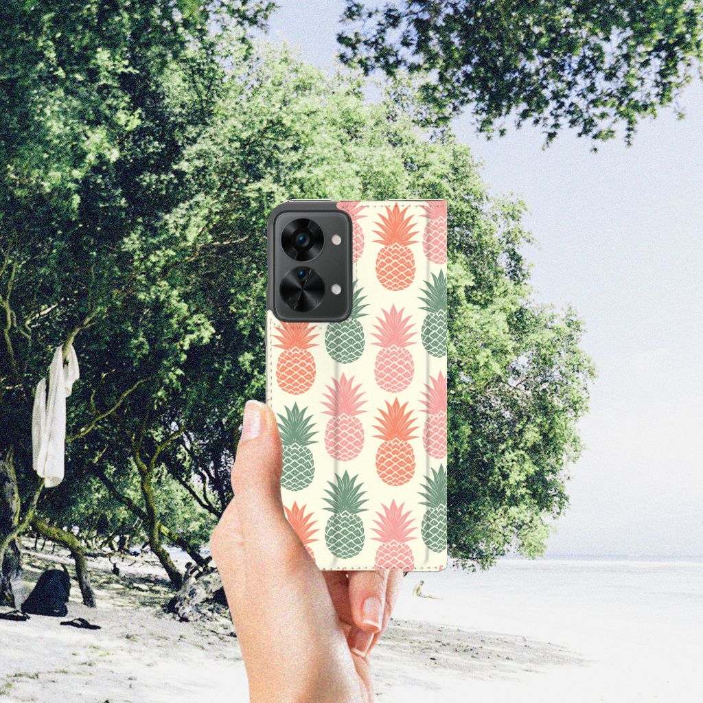 Ananas is een woord uit het Tupi, de taal van de Tupi-indianen, en betekent uitmuntende vrucht. Dit fruit van zeer hoge kwaliteit staat op onze superieure boekhoesjes, stand cases, hard cases en TPU cases. Jij blijft er gezond uitzien als je zo nu en dan een hap neemt van een Ananas , jouw smartphone blijft tip top in orde als je er een leuk telefoonhoesje omheen doet. Een ananas heeft stevig, veerkrachtig vruchtvlees. Een beetje te vergelijken met het TPU in onze hoesjes. TPU is elastisch materiaal, dat zeer buigzaam is. Vandaar dat het zeer schokbestendig is. Het ananas design staat op een stand case. Deze OnePlus Nord 2T Flip Style Cover beschermt jouw telefoon aan alle kanten en beschikt over een 1 opbergvakje en een speciale standaard. Het hoesje wordt afgesloten met een magneet aan de binnenzijde. De houder aan de binnenzijde is van TPU.