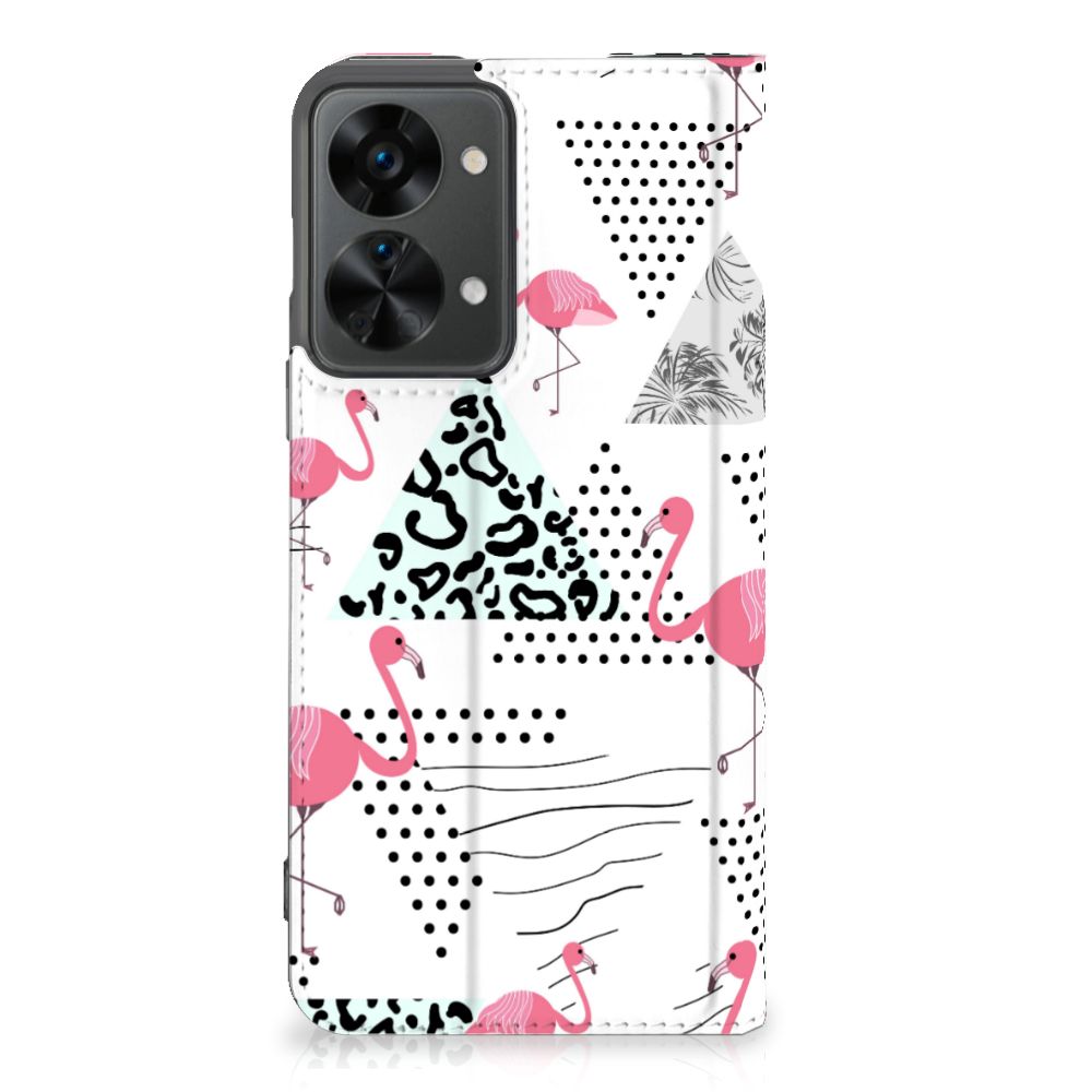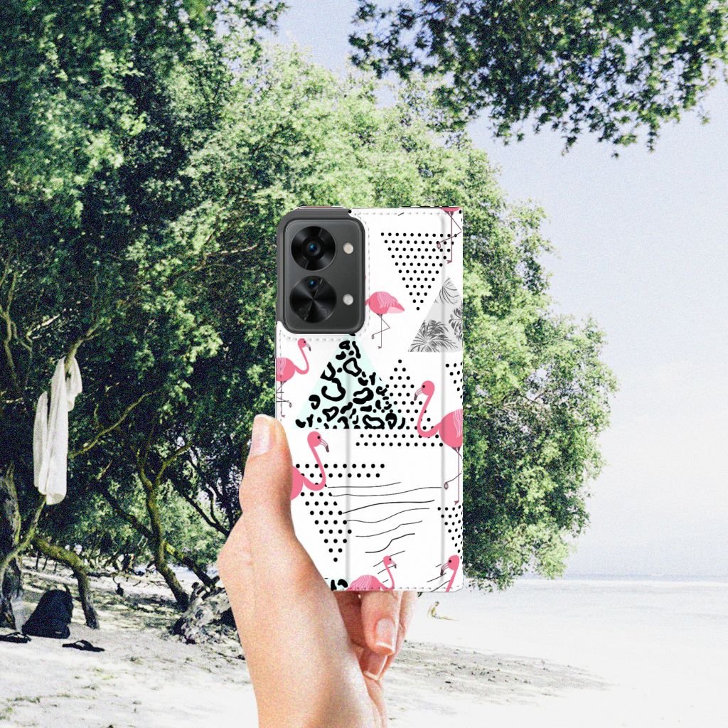 Een OnePlus Nord 2T Hoesje maken met Flamingo Triangle is in vele opzichten bijzonder. De rode flamingo op het hoesje komt oorspronkelijk uit het Caraïbische gebied. Stel dat je in deze regio vakantie viert, dan val je zonder meer op met dit hoesje met flamingo’s en driehoeken. Deze stand case biedt bescherming voor alle zijden van je telefoon. Jouw smartphone ligt goed opgeborgen in de TPU houder aan de binnenzijde en in dit gedeelte van het hoesje met flamingo’s en driehoeken zit de magnetische sluiting. Ook de palmbomen op deze stand case bieden het ultieme vakantiegevoel. De stand case met flamingo’s en driehoeken heeft vakjes voor pasjes en is op maat gemaakt.