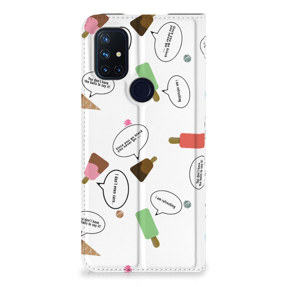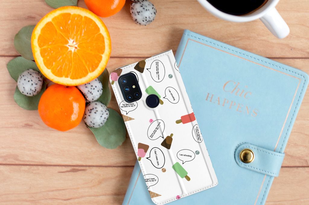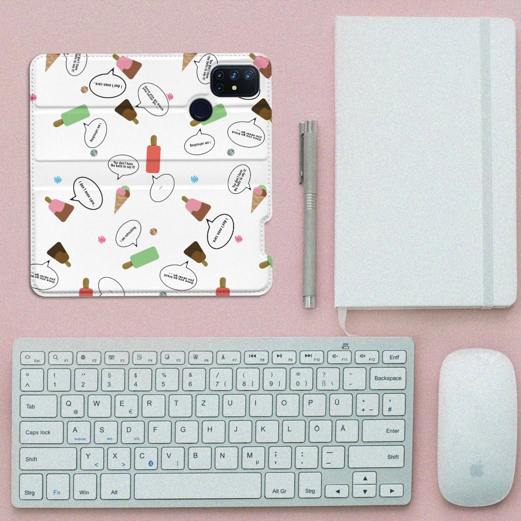 Van deze vrolijke OnePlus Nord N10 5G Flip Style Cover met daarop verschillende soorten ijsjes met tekstwolkjes krijg je sowieso een vrij en zomers gevoel. De zomer komt naar je toe met deze print van ijsjes met tekstwolkjes. Ben je op het strand, dan ontbreekt een lekker ijsje natuurlijk niet. Net zoals je je smartphone bij de hand hebt, met daaromheen een design hoesje met bijzondere ijsjes en tekstwolkjes. Jouw telefoon kan dan de bescherming in de vorm van een stand case met ijsjes zeer goed gebruiken. Alle zijden van dit hoesje worden bedrukt met ijsjes en dankzij de speciale standaard is het erg prettig om filmpjes te bekijken. De case wordt aan de binnenzijde met een magneet afgesloten en de houder aan de binnenzijde is van TPU. Onder alle weersomstandigheden zal deze case met 1 opbergvakje en ijsjes perfect functioneren, ook op het strand met een ijsje in je hand.