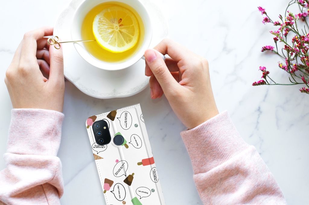 Van deze vrolijke OnePlus Nord N100 Flip Style Cover met daarop verschillende soorten ijsjes met tekstwolkjes krijg je sowieso een vrij en zomers gevoel. De zomer komt naar je toe met deze print van ijsjes met tekstwolkjes. Ben je op het strand, dan ontbreekt een lekker ijsje natuurlijk niet. Net zoals je je smartphone bij de hand hebt, met daaromheen een design hoesje met bijzondere ijsjes en tekstwolkjes. Jouw telefoon kan dan de bescherming in de vorm van een stand case met ijsjes zeer goed gebruiken. Alle zijden van dit hoesje worden bedrukt met ijsjes en dankzij de speciale standaard is het erg prettig om filmpjes te bekijken. De case wordt aan de binnenzijde met een magneet afgesloten en de houder aan de binnenzijde is van TPU. Onder alle weersomstandigheden zal deze case met 1 opbergvakje en ijsjes perfect functioneren, ook op het strand met een ijsje in je hand.