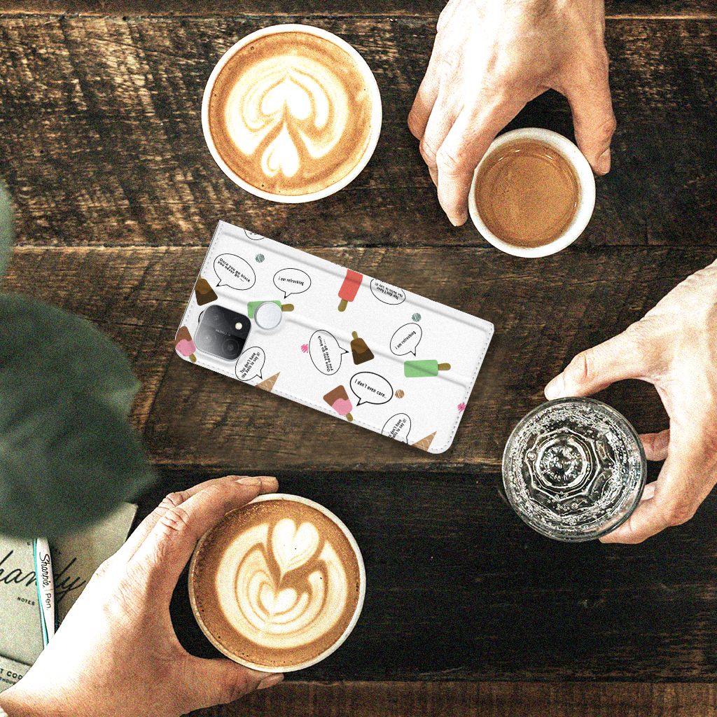 Van deze vrolijke OPPO A15 Flip Style Cover met daarop verschillende soorten ijsjes met tekstwolkjes krijg je sowieso een vrij en zomers gevoel. De zomer komt naar je toe met deze print van ijsjes met tekstwolkjes. Ben je op het strand, dan ontbreekt een lekker ijsje natuurlijk niet. Net zoals je je smartphone bij de hand hebt, met daaromheen een design hoesje met bijzondere ijsjes en tekstwolkjes. Jouw telefoon kan dan de bescherming in de vorm van een stand case met ijsjes zeer goed gebruiken. Alle zijden van dit hoesje worden bedrukt met ijsjes en dankzij de speciale standaard is het erg prettig om filmpjes te bekijken. De case wordt aan de binnenzijde met een magneet afgesloten en de houder aan de binnenzijde is van TPU. Onder alle weersomstandigheden zal deze case met 1 opbergvakje en ijsjes perfect functioneren, ook op het strand met een ijsje in je hand.